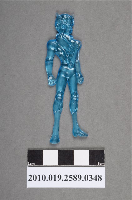 1.本物件為藍色人型尪仔。硬質塑膠材質,扁平,單一藍色,雙面浮雕圖案,兩面圖案相同。圖案為站立男性人型,頭戴面具式頭盔,頭盔上有角狀構件,雙手握拳垂下,有護膝裝備。