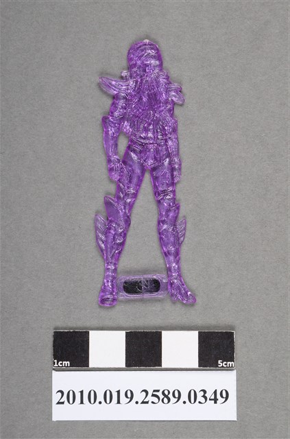 1.本物件為紫色人型尪仔仙。硬質塑膠材質,扁平,單一紫色,雙面浮雕圖案。正面圖案為站立的人型,長髮,身上穿有戰甲,肩膀造型往外延伸,靴子的小腿部位上有片狀構件。雙腳中間有塑膠片,其上貼有貼紙,有水字樣和圖形。依其造型判斷,此尪仔仙應為漫畫聖鬥士星矢中的人物。2.漫畫聖鬥士星矢為日本漫畫家車田正美之代表作,於西元1985年開始連載,隔年電視動畫版在日本播出,進而風靡全世界。內容為女神雅典娜和聖鬥士們與邪惡勢力展開對戰,保護世界的故事。其後又延伸出其他續集和篇章作品。3.尪仔仙尺寸大致可分成小、中、大型,小型約長2-5公分,中型約長8-15公分,顏色以單色為主。有些大型的則可長達30公分左右,以菩薩、神仙和民間傳說故事人物等造型為主,塗上金銀紅黃彩漆等亮色。1960、70年代的尪仔仙多以民間傳說故事、歌仔戲、布袋戲人物為造型。1980年代改以卡通、電玩、漫畫人物造型為主。常見玩法之一為兩人(或多人)各持一只尪仔仙,輪流用手指彈射,看誰的尪仔仙先疊在對方上面,便可贏得對方用來對戰或是約定的尪仔仙。