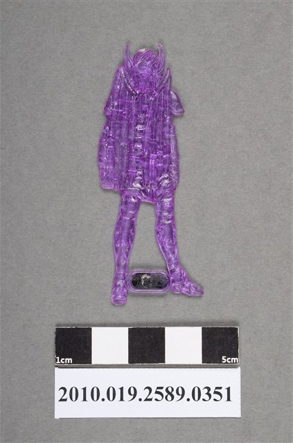 1.本物件為漫畫聖鬥士星矢之黃金聖鬥士射手座艾奧羅斯尪仔仙。硬質塑膠材質,扁平,單一紫色,雙面浮雕圖案。正面圖案為站立的人型,身上穿有戰甲(黃金聖衣),頭上有翅膀狀裝飾物,黃金聖衣造型有翅膀。雙腳中間有塑膠片,其上貼有貼紙,有木字樣和圖形。射手座艾奧羅斯武器為黃金弓箭。