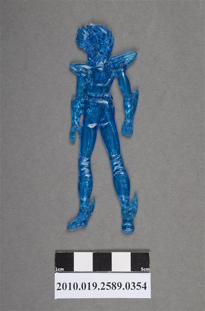 1.本物件為漫畫聖鬥士星矢之青銅聖鬥士天馬座星矢尪仔仙。硬質塑膠材質,扁平,單一藍色,雙面浮雕圖案。正面圖案為站立的人型,頭上有造型物,身上穿有戰甲(聖衣),肩膀造型往外延伸,靴子腳踝部分有角狀構件,帶有手套,右手握拳。在漫畫設定中,星矢為主角,其絕招為天馬流星拳等。