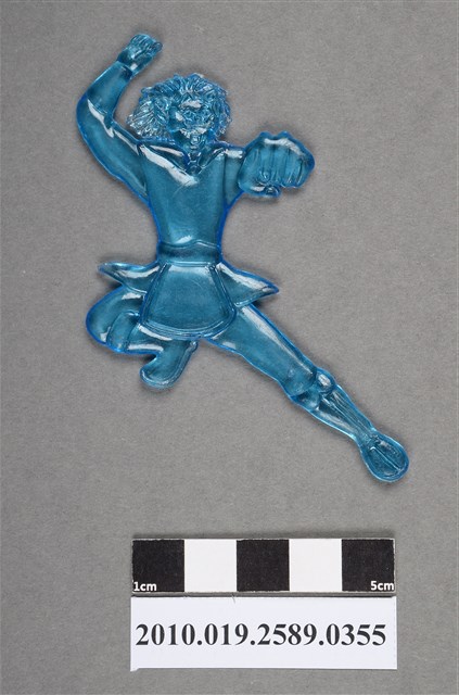 1.本物件為功夫人型尪仔仙。硬質塑膠材質,扁平,單一藍色,雙面浮雕圖案,兩面圖案相同。圖案為擺出功夫姿勢的人型,頭髮蓬鬆,臉上戴有半截面罩,一手往上舉,一手握拳往前擊,一腳呈蹲姿,另一腳伸直。2.尪仔仙尺寸大致可分成小、中、大型,小型約長2-5公分,中型約長8-15公分,顏色以單色為主。有些大型的則可長達30公分左右,以菩薩、神仙和民間傳說故事人物等造型為主,塗上金銀紅黃彩漆等亮色。1960、70年代的尪仔仙多以民間傳說故事、歌仔戲、布袋戲人物為造型。1980年代改以卡通、電玩、漫畫人物造型為主。常見玩法之一為兩人(或多人)各持一只尪仔仙,輪流用手指彈射,看誰的尪仔仙先疊在對方上面,便可贏得對方用來對戰或是約定的尪仔仙。
