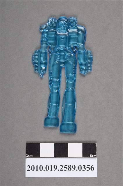 1.本物件為藍色機器人型尪仔仙。硬質塑膠材質,扁平,單一藍色,雙面浮雕圖案,兩面圖案相同。圖案為站立機器人型,肩上有特殊構件,雙手垂下,手臂側面有構件,腳部比例長,有一腳稍微抬起。2.尪仔仙尺寸大致可分成小、中、大型,小型約長2-5公分,中型約長8-15公分,顏色以單色為主。有些大型的則可長達30公分左右,以菩薩、神仙和民間傳說故事人物等造型為主,塗上金銀紅黃彩漆等亮色。1960、70年代的尪仔仙多以民間傳說故事、歌仔戲、布袋戲人物為造型。1980年代改以卡通、電玩、漫畫人物造型為主。常見玩法之一為兩人(或多人)各持一只尪仔仙,輪流用手指彈射,看誰的尪仔仙先疊在對方上面,便可贏得對方用來對戰或是約定的尪仔仙。