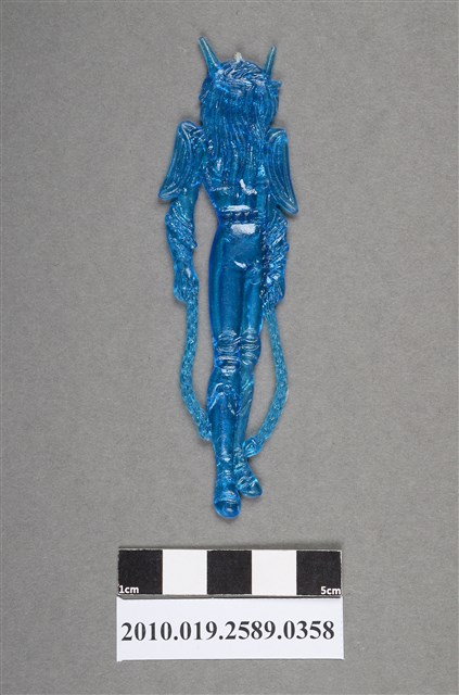 1.本物件為漫畫聖鬥士星矢之青銅聖鬥士仙女座瞬尪仔仙。硬質塑膠材質,扁平,單一藍色,雙面浮雕圖案。正面圖案為站立的人型,頭上有造型物,呈雙角狀,身上穿有戰甲(聖衣),肩膀和手臂處有護甲,雙手用纏繞方式拿著鍊型武器。在漫畫設定中,仙女座瞬和天馬座星矢都是青銅聖鬥士。