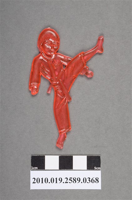 1.本物件為功夫人型尪仔仙。硬質塑膠材質,扁平,單一橘紅色,雙面浮雕圖案,兩面圖案相同。圖案為擺出功夫姿勢的人型,無法判斷性別,腰間有綁帶,呈現往上踢腿的動作,雙手握拳往下擺,一腳伸直往上踢,另一腳尖著地。2.尪仔仙尺寸大致可分成小、中、大型,小型約長2-5公分,中型約長8-15公分,顏色以單色為主。有些大型的則可長達30公分左右,以菩薩、神仙和民間傳說故事人物等造型為主,塗上金銀紅黃彩漆等亮色。1960、70年代的尪仔仙多以民間傳說故事、歌仔戲、布袋戲人物為造型。1980年代改以卡通、電玩、漫畫人物造型為主。常見玩法之一為兩人(或多人)各持一只尪仔仙,輪流用手指彈射,看誰的尪仔仙先疊在對方上面,便可贏得對方用來對戰或是約定的尪仔仙。