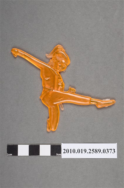 1.本物件為功夫人型尪仔仙。硬質塑膠材質,扁平,單一橘色,雙面浮雕圖案,兩面圖案相同。圖案為擺出功夫姿勢的女性人型,綁有馬尾,腰間有綁帶,呈現踢腿的動作,一手握拳往身後伸,一腳伸直往前踢,另一腳膝蓋彎曲。2.尪仔仙尺寸大致可分成小、中、大型,小型約長2-5公分,中型約長8-15公分,顏色以單色為主。有些大型的則可長達30公分左右,以菩薩、神仙和民間傳說故事人物等造型為主,塗上金銀紅黃彩漆等亮色。1960、70年代的尪仔仙多以民間傳說故事、歌仔戲、布袋戲人物為造型。1980年代改以卡通、電玩、漫畫人物造型為主。常見玩法之一為兩人(或多人)各持一只尪仔仙,輪流用手指彈射,看誰的尪仔仙先疊在對方上面,便可贏得對方用來對戰或是約定的尪仔仙。