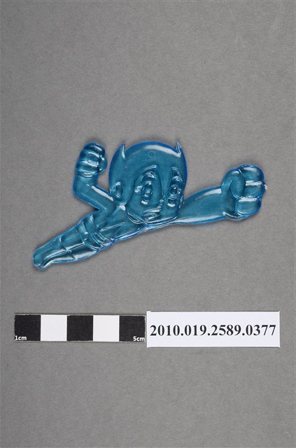 1.本物件為漫畫原子小金剛之小金剛尪仔仙。硬質塑膠材質,扁平,單一藍色,雙面浮雕圖案,兩面圖案相同。圖案為頭部有尖角造型的小金剛雙手握拳,一拳伸向前,另一拳往後擺至頭部旁,雙腳併攏,呈飛行之姿勢。
