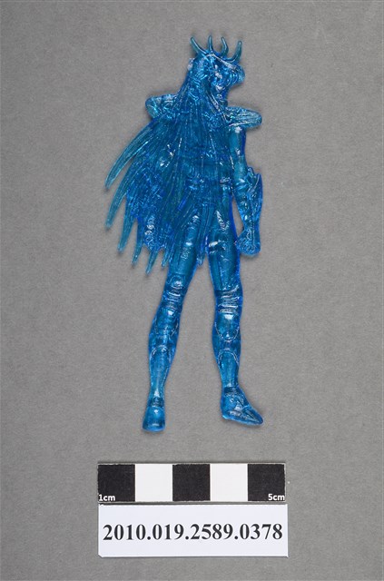 1.本物件為漫畫聖鬥士星矢之青銅聖鬥士天龍座紫龍尪仔仙。硬質塑膠材質,扁平,單一藍色,雙面浮雕圖案。正面圖案為站立的人型、長髮,頭上戴有角狀裝飾品,身上穿有戰甲(聖衣),左手手套側面有圓形盾牌,右手手套側面為龍頭造型。在漫畫設定中,天龍座紫龍和天馬座星矢都是青銅聖鬥士。