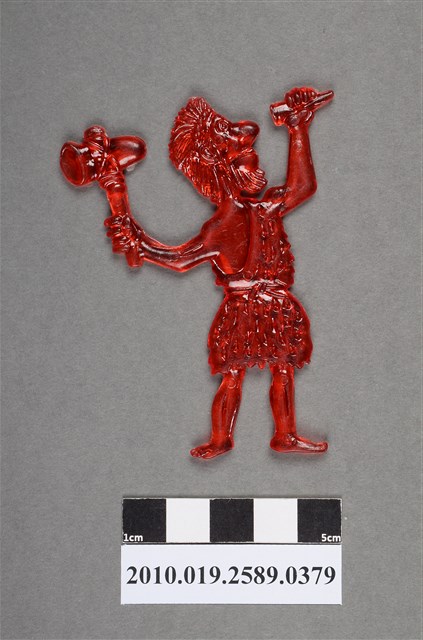 1.本物件為持槌人型尪仔仙。硬質塑膠材質,扁平,單一紅色,雙面浮雕圖案,兩面圖案相同。圖案為工作的原始人,男性,留有絡腮鬍,身穿獸皮紋的衣服,露出半邊肩膀和胸膛,無穿鞋,一手拿著石錘,一手舉著錐形釘。2.尪仔仙尺寸大致可分成小、中、大型,小型約長2-5公分,中型約長8-15公分,顏色以單色為主。有些大型的則可長達30公分左右,以菩薩、神仙和民間傳說故事人物等造型為主,塗上金銀紅黃彩漆等亮色。1960、70年代的尪仔仙多以民間傳說故事、歌仔戲、布袋戲人物為造型。1980年代改以卡通、電玩、漫畫人物造型為主。常見玩法之一為兩人(或多人)各持一只尪仔仙,輪流用手指彈射,看誰的尪仔仙先疊在對方上面,便可贏得對方用來對戰或是約定的尪仔仙。