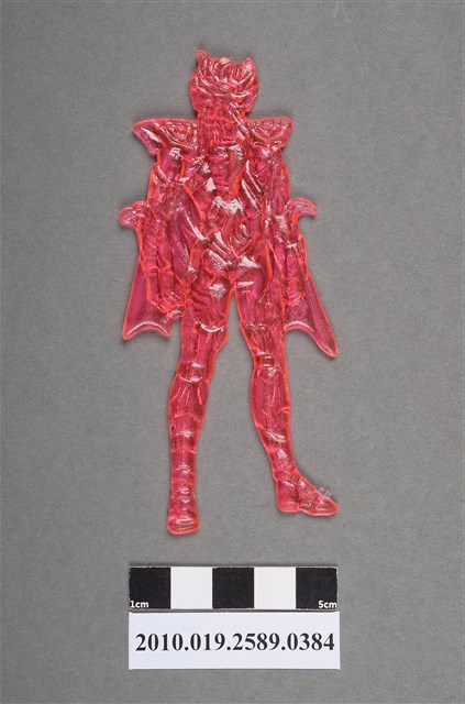 1.本物件為漫畫聖鬥士星矢之黃金聖鬥士水瓶座卡妙尪仔仙。硬質塑膠材質,扁平,單一粉紅色,雙面浮雕圖案。正面圖案為站立的人型,身上穿有戰甲(黃金聖衣),肩膀服裝造型明顯,配有披風,手套接近手肘處有往外延伸的角度。在漫畫設定中,水瓶座卡妙使用冰進行戰鬥,絕招有冰之柩和曙光女神之寬恕等。