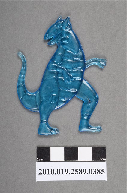 1.本物件為藍色恐龍型尪仔仙。硬質塑膠材質,扁平,單一藍色,雙面浮雕圖案,兩面圖案相同。圖案為站立之恐龍型外觀,頭小嘴型長,嘴巴微開,頭部兩側有倒7字型的部位,腹部有橫條紋路,上肢短小,下肢粗壯,有長尾巴。2.尪仔仙尺寸大致可分成小、中、大型,小型約長2-5公分,中型約長8-15公分,顏色以單色為主。有些大型的則可長達30公分左右,以菩薩、神仙和民間傳說故事人物等造型為主,塗上金銀紅黃彩漆等亮色。1960、70年代的尪仔仙多以民間傳說故事、歌仔戲、布袋戲人物為造型。1980年代改以卡通、電玩、漫畫人物造型為主。常見玩法之一為兩人(或多人)各持一只尪仔仙,輪流用手指彈射,看誰的尪仔仙先疊在對方上面,便可贏得對方用來對戰或是約定的尪仔仙。