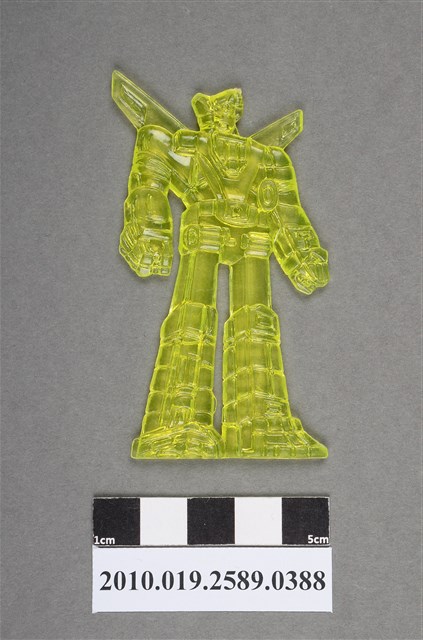 1.本物件為卡通聖戰士(百獸王)之聖戰士尪仔仙。硬質塑膠材質,扁平,單一黃色,雙面浮雕圖案,兩面圖案相同。圖案為機器人型,其背後有V字裝飾,其手與腳可見獅頭造型。