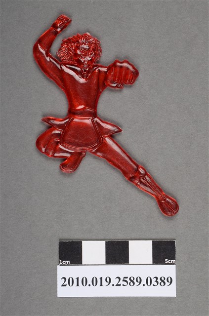 1.本物件為功夫人型尪仔仙。硬質塑膠材質,扁平,單一紅色,雙面浮雕圖案,兩面圖案相同。圖案為擺出功夫姿勢的男性人型,頭髮蓬鬆,臉上戴有半截面罩,一手往上舉,一手握拳往前擊,一腳呈蹲姿,另一腳伸直。2.尪仔仙尺寸大致可分成小、中、大型,小型約長2-5公分,中型約長8-15公分,顏色以單色為主。有些大型的則可長達30公分左右,以菩薩、神仙和民間傳說故事人物等造型為主,塗上金銀紅黃彩漆等亮色。1960、70年代的尪仔仙多以民間傳說故事、歌仔戲、布袋戲人物為造型。1980年代改以卡通、電玩、漫畫人物造型為主。常見玩法之一為兩人(或多人)各持一只尪仔仙,輪流用手指彈射,看誰的尪仔仙先疊在對方上面,便可贏得對方用來對戰或是約定的尪仔仙。