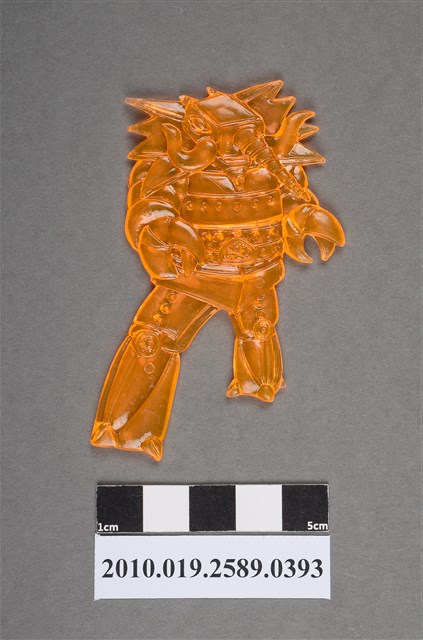 1.本物件為橘色機器人型尪仔仙。硬質塑膠材質,扁平,單一橘色,雙面浮雕圖案,兩面圖案相同。圖案為站立之機器人型,頭部為方型,正前方有長鑽子,兩側邊有彎曲角狀物,頸部有放射狀造型,腰部有皮帶造型,雙手為鉗狀,膝蓋處有圓形圖案。2.尪仔仙尺寸大致可分成小、中、大型,小型約長2-5公分,中型約長8-15公分,顏色以單色為主。有些大型的則可長達30公分左右,以菩薩、神仙和民間傳說故事人物等造型為主,塗上金銀紅黃彩漆等亮色。1960、70年代的尪仔仙多以民間傳說故事、歌仔戲、布袋戲人物為造型。1980年代改以卡通、電玩、漫畫人物造型為主。常見玩法之一為兩人(或多人)各持一只尪仔仙,輪流用手指彈射,看誰的尪仔仙先疊在對方上面,便可贏得對方用來對戰或是約定的尪仔仙。