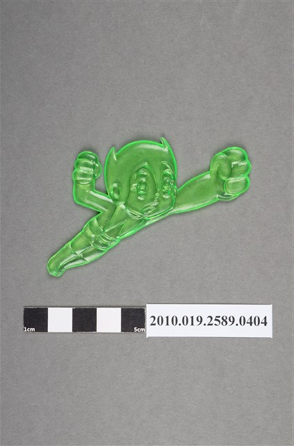 1.本物件為漫畫原子小金剛之小金剛尪仔仙。硬質塑膠材質,扁平,單一綠色,雙面浮雕圖案,兩面圖案相同。圖案為頭部有尖角造型的小金剛雙手握拳,一拳伸向前,另一拳往後擺至頭部旁,雙腳併攏,呈飛行之姿勢。