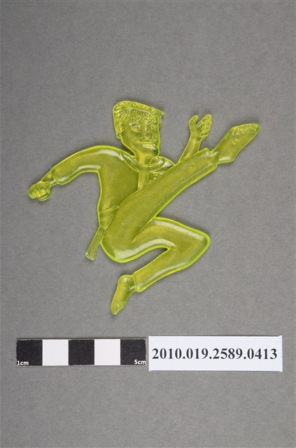 1.本物件為功夫人型尪仔仙。硬質塑膠材質,扁平,單一黃色,雙面浮雕圖案,兩面圖案相同。圖案為擺出功夫姿勢的男性人型,呈現跳躍踢腿的動作,一手握拳往身後伸,一手往順勢往上舉,一腳伸直往上踢,另一腳膝蓋彎曲。2.尪仔仙尺寸大致可分成小、中、大型,小型約長2-5公分,中型約長8-15公分,顏色以單色為主。有些大型的則可長達30公分左右,以菩薩、神仙和民間傳說故事人物等造型為主,塗上金銀紅黃彩漆等亮色。1960、70年代的尪仔仙多以民間傳說故事、歌仔戲、布袋戲人物為造型。1980年代改以卡通、電玩、漫畫人物造型為主。常見玩法之一為兩人(或多人)各持一只尪仔仙,輪流用手指彈射,看誰的尪仔仙先疊在對方上面,便可贏得對方用來對戰或是約定的尪仔仙。