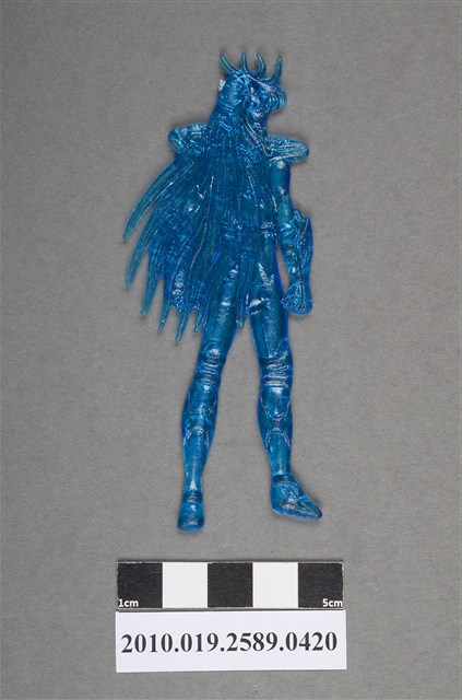 1.本物件為漫畫聖鬥士星矢之青銅聖鬥士天龍座紫龍尪仔仙。硬質塑膠材質,扁平,單一藍色,雙面浮雕圖案。正面圖案為站立的人型、長髮,頭上戴有角狀裝飾品,身上穿有戰甲(聖衣),左手手套側面有圓形盾牌,右手手套側面為龍頭造型。在漫畫設定中,天龍座紫龍和天馬座星矢都是青銅聖鬥士。