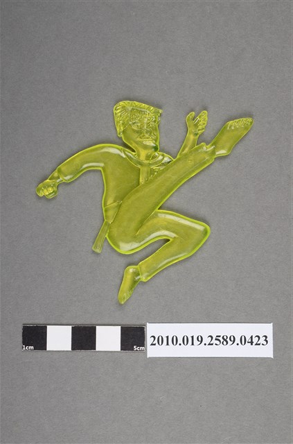 1.本物件為功夫人型尪仔仙。硬質塑膠材質,扁平,單一黃色,雙面浮雕圖案,兩面圖案相同。圖案為擺出功夫姿勢的男性人型,呈現跳躍踢腿的動作,一手握拳往身後伸,一手往順勢往上舉,一腳伸直往上踢,另一腳膝蓋彎曲。2.尪仔仙尺寸大致可分成小、中、大型,小型約長2-5公分,中型約長8-15公分,顏色以單色為主。有些大型的則可長達30公分左右,以菩薩、神仙和民間傳說故事人物等造型為主,塗上金銀紅黃彩漆等亮色。1960、70年代的尪仔仙多以民間傳說故事、歌仔戲、布袋戲人物為造型。1980年代改以卡通、電玩、漫畫人物造型為主。常見玩法之一為兩人(或多人)各持一只尪仔仙,輪流用手指彈射,看誰的尪仔仙先疊在對方上面,便可贏得對方用來對戰或是約定的尪仔仙。