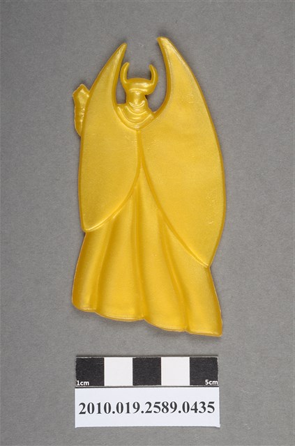 1.本物件為黃色人型尪仔仙。硬質塑膠材質,扁平,單一不透明黃色,雙面浮雕圖案。正面圖案為站立人型,頭上有2支角狀物,背後有2片似翅膀或是裝飾品的東西,下半身服裝為裙裝,雙手往上舉。2.尪仔仙尺寸大致可分成小、中、大型,小型約長2-5公分,中型約長8-15公分,顏色以單色為主。有些大型的則可長達30公分左右,以菩薩、神仙和民間傳說故事人物等造型為主,塗上金銀紅黃彩漆等亮色。1960、70年代的尪仔仙多以民間傳說故事、歌仔戲、布袋戲人物為造型。1980年代改以卡通、電玩、漫畫人物造型為主。常見玩法之一為兩人(或多人)各持一只尪仔仙,輪流用手指彈射,看誰的尪仔仙先疊在對方上面,便可贏得對方用來對戰或是約定的尪仔仙。