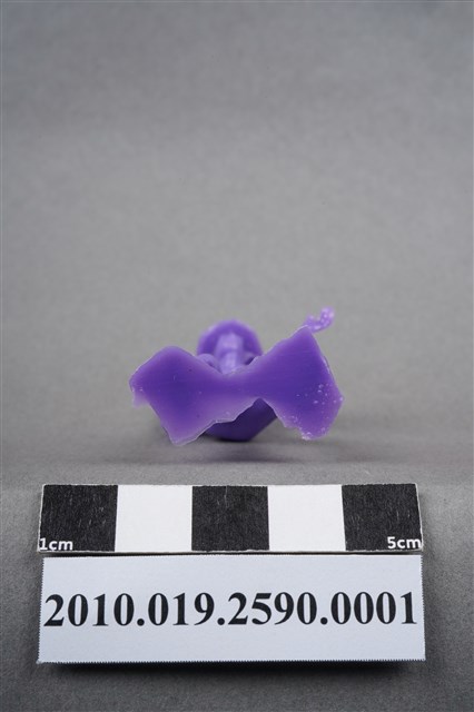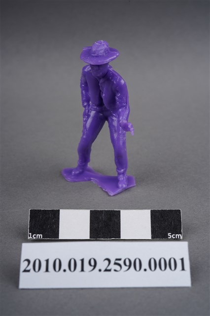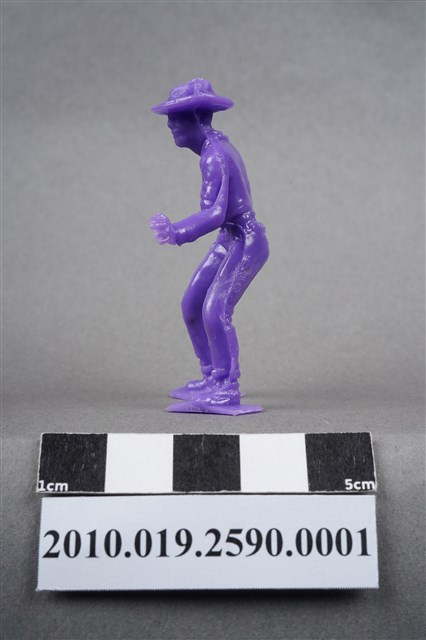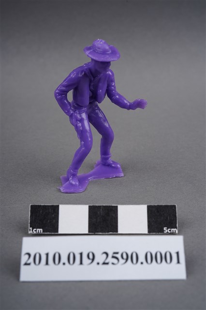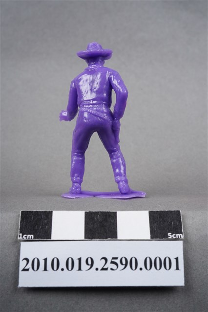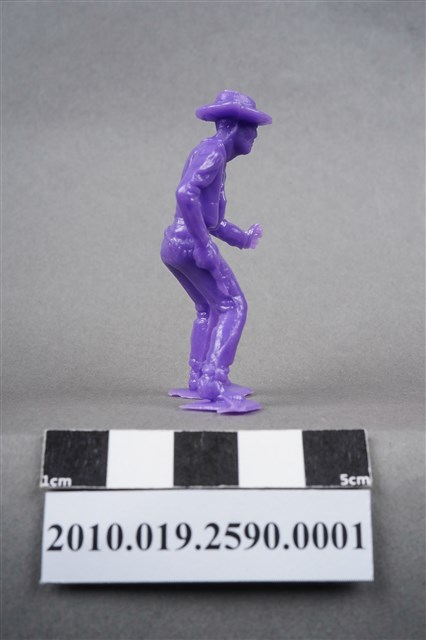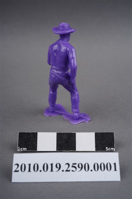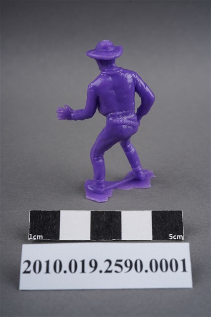1.本物件為紫色牛仔造型玩具士兵,高約5公分,寬約3公分,為塑膠材質。外型為牛仔,頭戴牛仔帽,著長袖短外套,脖繫領巾,腰間掛著槍套,右手扶槍,做預備拔槍的姿勢。身後的繫槍帶上可見子彈,靴子後跟隱約可見馬刺構造。腳下連接著稱為「pod feet」的底板,左腳邊的底板有斷裂痕跡,物件兩側可見射出接縫線。本系列玩具士兵多為相同塑膠模版,僅有顏色不同,或是同色同塑膠模版等形式。