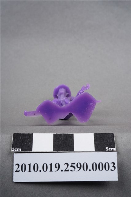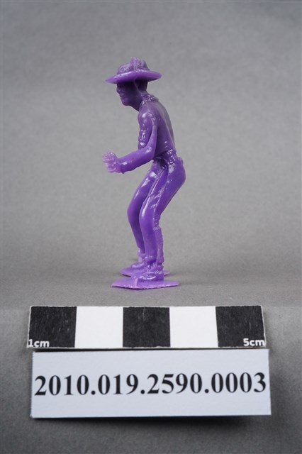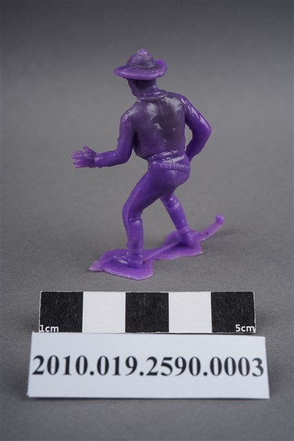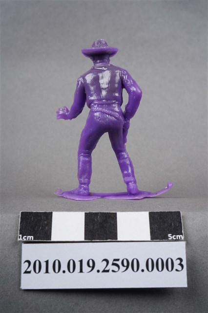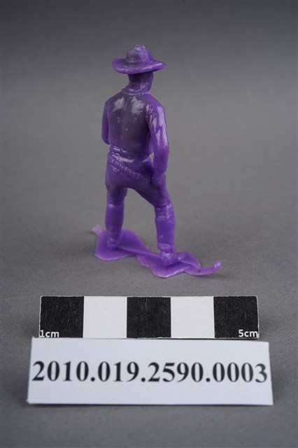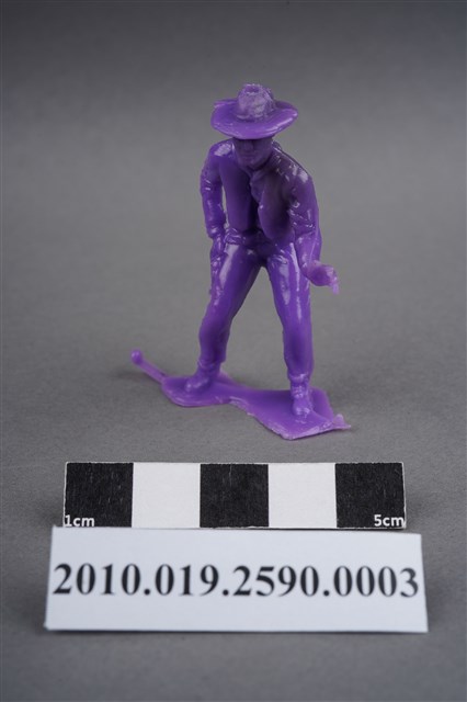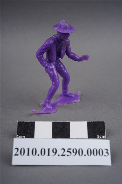 1.本物件為紫色牛仔造型玩具士兵,高約5公分,寬約3公分,為塑膠材質。外型為牛仔,頭戴牛仔帽,著長袖短外套,脖繫領巾,腰間掛著槍套,右手扶槍,做預備拔槍的姿勢。身後的繫槍帶上可見子彈,靴子後跟隱約可見馬刺構造。腳下連接著稱為「pod feet」的底板,底板兩側有突出的殘膠,物件兩側可見射出接縫線。本系列玩具士兵多為相同塑膠模版,僅有顏色不同,或是同色同塑膠模版等形式。