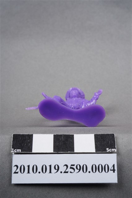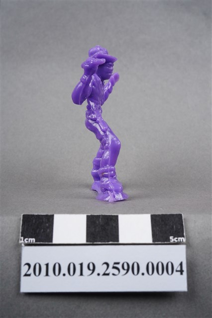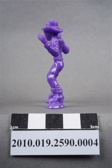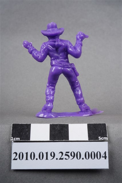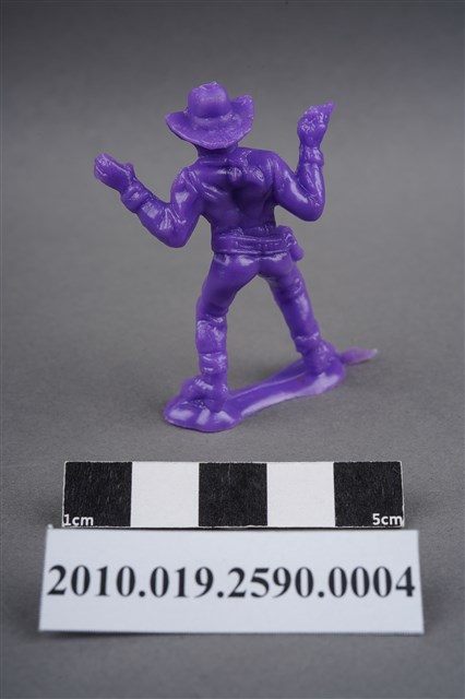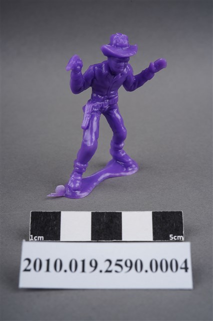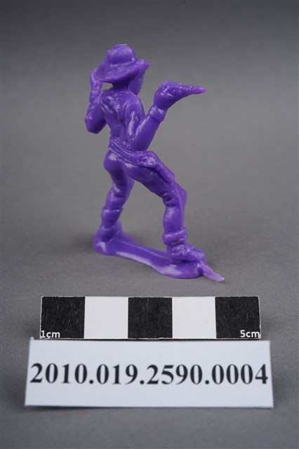 1.本物件為紫色牛仔造型玩具士兵,高約5公分,寬約3.5公分,為塑膠材質。外型為牛仔,頭戴牛仔帽,著長袖上衣,腰間掛著槍套,右手拿著槍,兩手高舉做投降姿勢,物件背後可見外露之領巾,領巾右下方有一黑色污痕,身後的繫槍帶上可見子彈,靴子後跟隱約可見馬刺構造。腳下連接著稱為「pod feet」的底板,底板右側有殘膠,物件兩側可見射出接縫線。本系列玩具士兵多為相同塑膠模版,僅有顏色不同,或是同色同塑膠模版等形式。