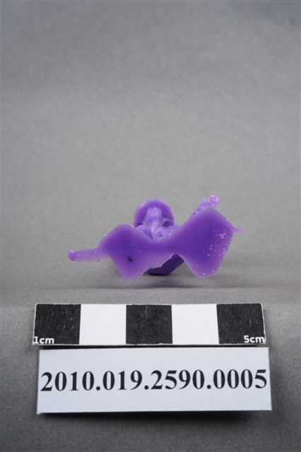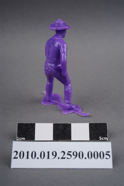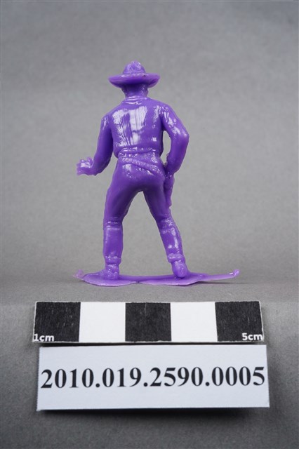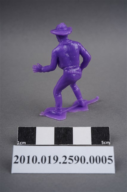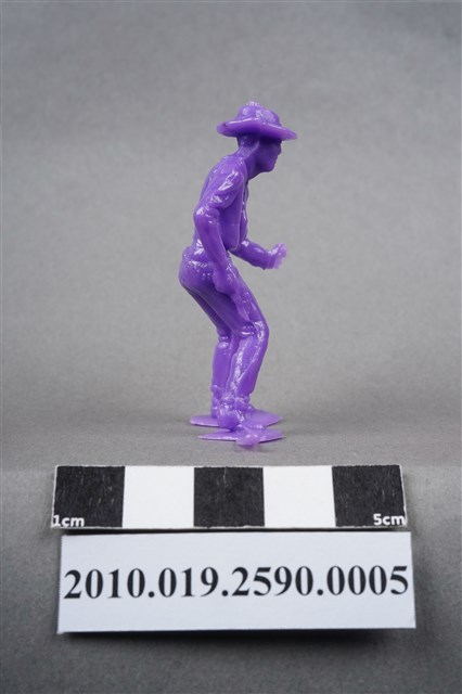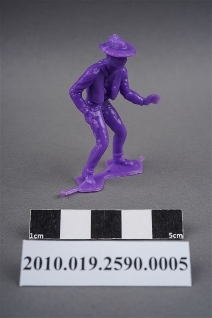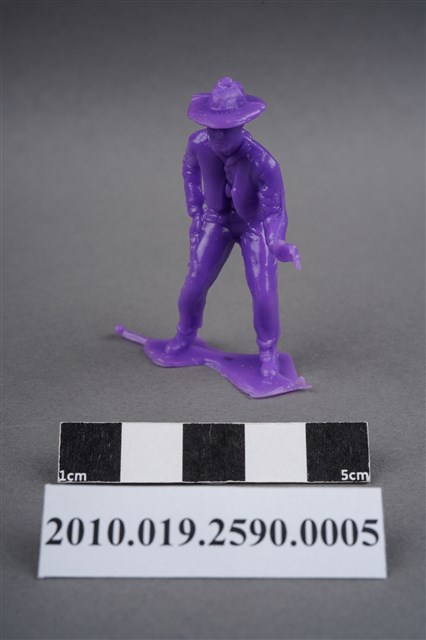 1.本物件為紫色牛仔造型玩具士兵,高約5公分,寬約3公分,為塑膠材質。外型為牛仔,頭戴牛仔帽,著長袖短外套,脖繫領巾,腰間掛著槍套,右手扶槍,做預備拔槍的姿勢。身後的繫槍帶上可見子彈,扶槍的手部有一黑點,靴子後跟隱約可見馬刺構造。腳下連接著稱為「pod feet」的底板,底板兩側均有殘膠,物件兩側可見射出接縫線。本系列玩具士兵多為相同塑膠模版,僅有顏色不同,或是同色同塑膠模版等形式。