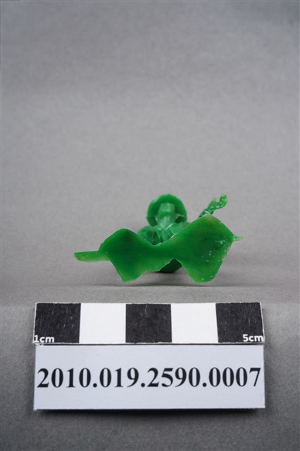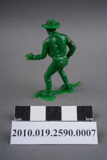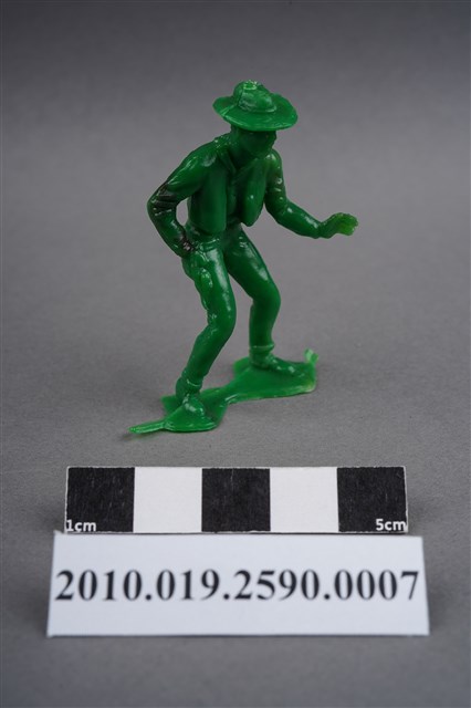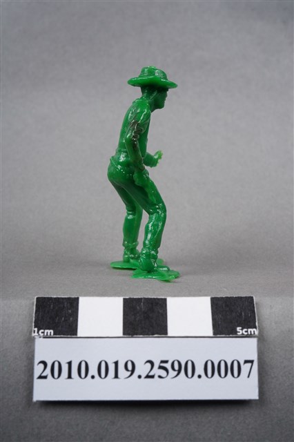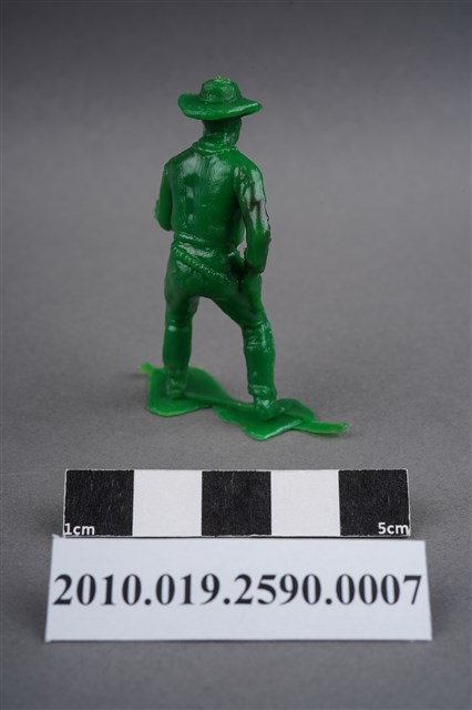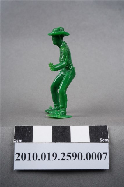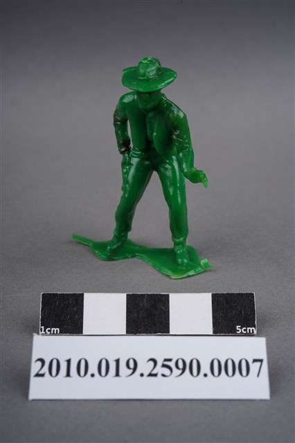 1.本物件為綠色牛仔造型玩具士兵,高約5公分,寬約3公分,為塑膠材質。外型為牛仔,頭戴牛仔帽,著長袖短外套,右手手肘及袖口處有深綠色色塊,脖繫領巾,腰間掛著槍套,右手扶槍,做預備拔槍的姿勢。身後的繫槍帶上可見子彈,扶槍的手部有一黑點,靴子後跟隱約可見馬刺構造。腳下連接著稱為「pod feet」的底板,底板些微上翹,兩側均有殘膠,底板底部有些起泡狀況,物件兩側可見射出接縫線。本系列玩具士兵多為相同塑膠模版,僅有顏色不同,或是同色同塑膠模版等形式。
