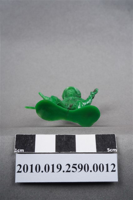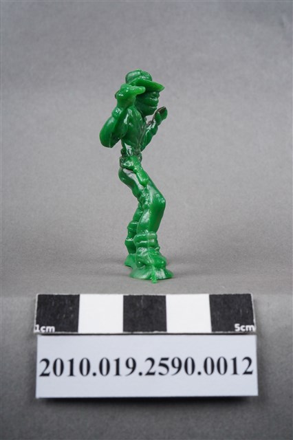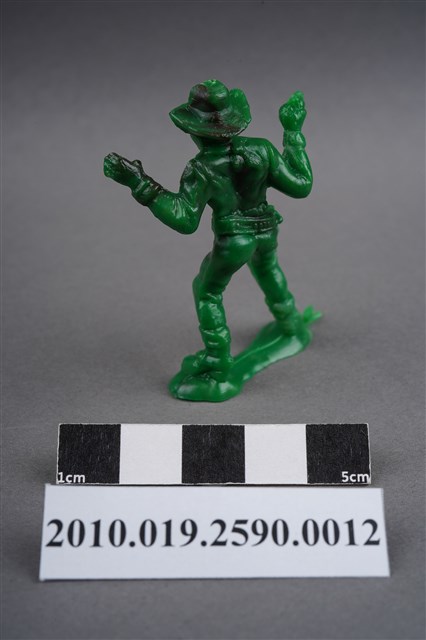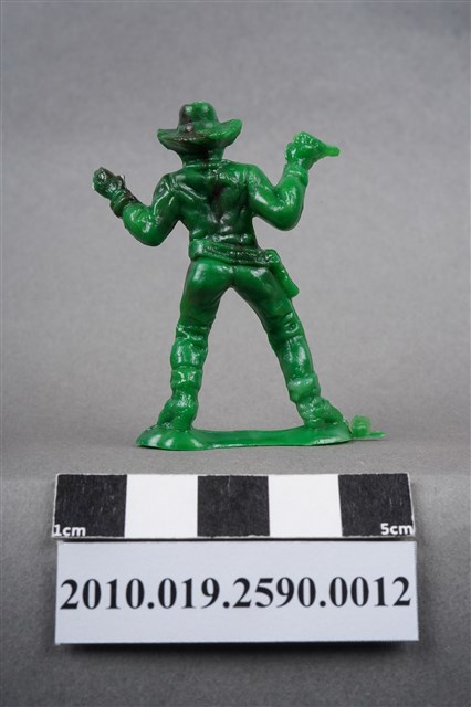 1.本物件為紫色牛仔造型玩具士兵,高約5公分,寬約3.5公分,為塑膠材質。外型為牛仔,頭戴牛仔帽,著長袖上衣,腰間掛著槍套,右手拿著槍,兩手高舉做投降姿勢,左大腿近腰處及胯間、左手手掌有黑色色塊。物件背面帽沿、背部、左手有多處黑色色塊,背部有外露的領巾及衣服皺摺,身後的繫槍帶上可見子彈,靴子後跟隱約可見馬刺構造。腳下連接著稱為「pod feet」的底板,底板右側有殘膠,底部中央有一似斷裂處的黑色線條,物件兩側可見射出接縫線。本系列玩具士兵多為相同塑膠模版,僅有顏色不同,或是同色同塑膠模版等形式。