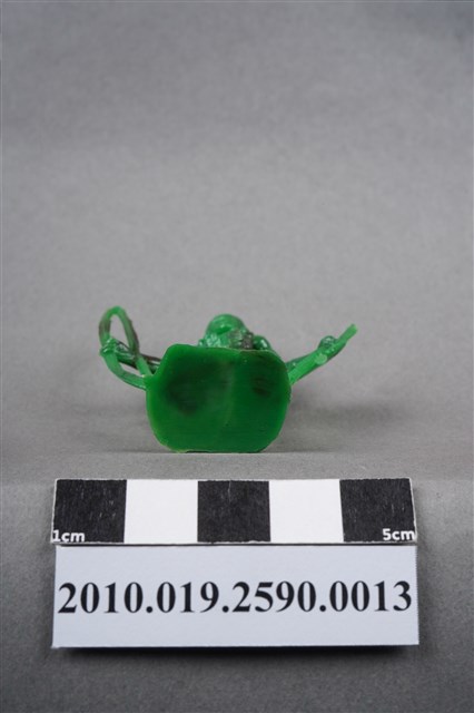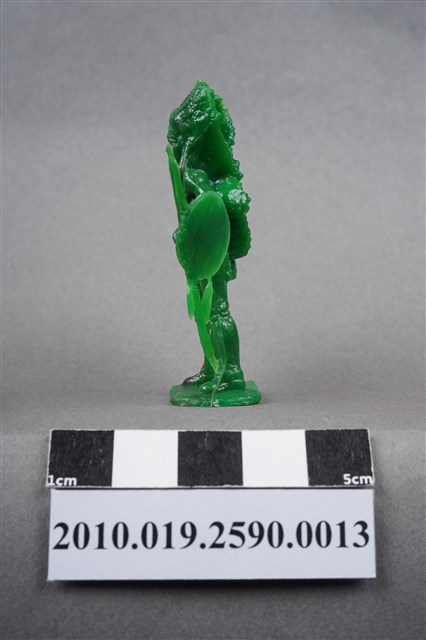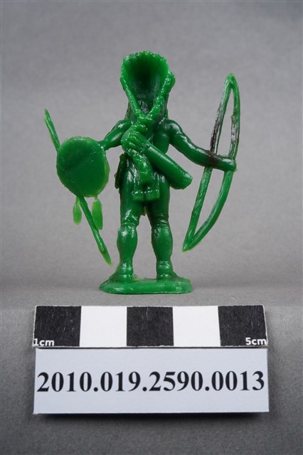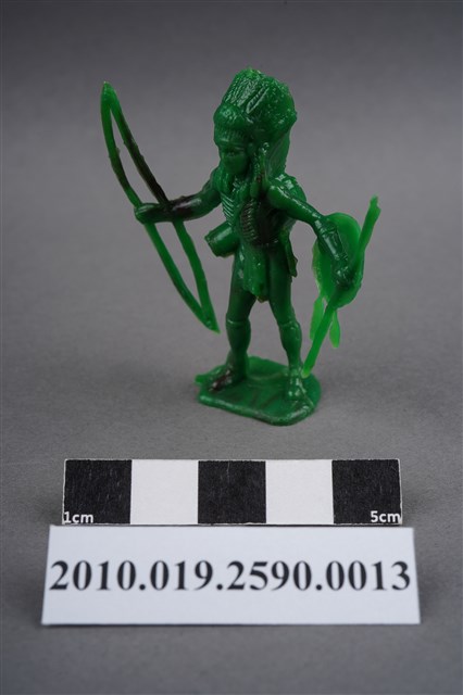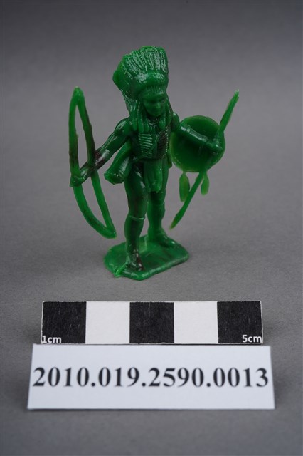 1.本物件為綠色印地安人造型玩具士兵,高約5公分,寬約4公分,為塑膠材質。外型為印地安人,頭戴羽冠,胸前應為由羽冠延伸下來的飾物,著長褲,繫有腰帶,右手持弓,左手手臂裝備飾有羽毛的圓盾,手持一棍狀物,可能為矛。身上、手臂及弓有多處黑色色塊。背後揹著箭筒,左腳內側有殘膠,腳下連接著稱為「pod feet」的底板,底板有黑色渲染狀色塊,物件兩側可見射出接縫線。本系列玩具士兵多為相同塑膠模版,僅有顏色不同,或是同色同塑膠模版等形式。