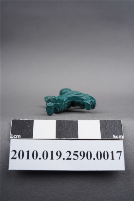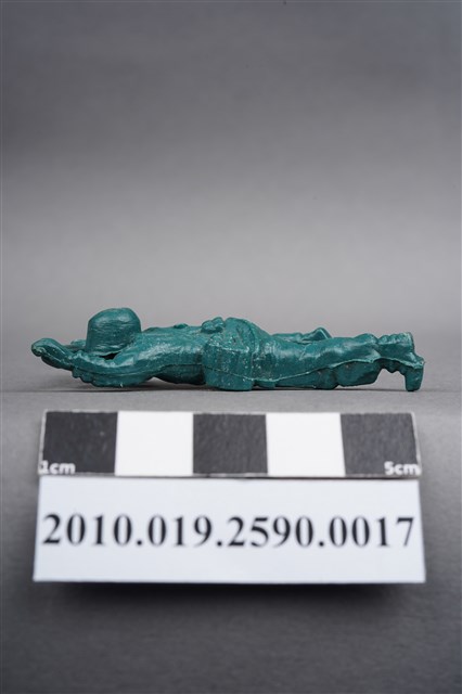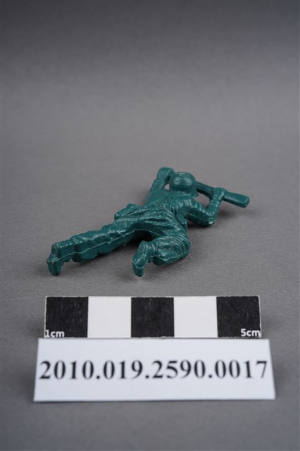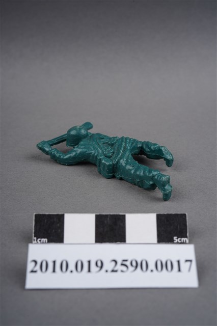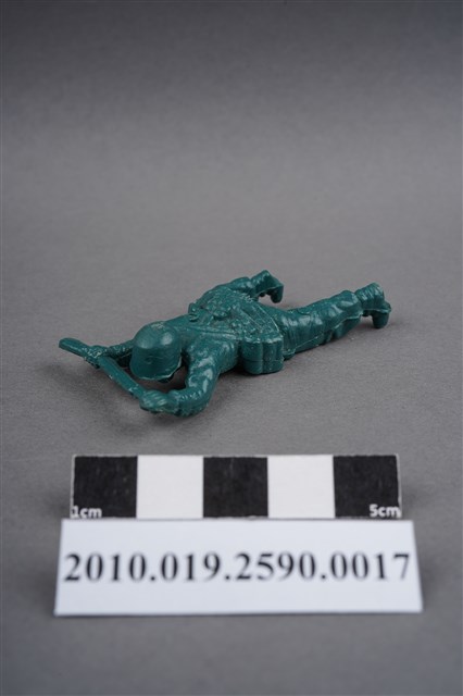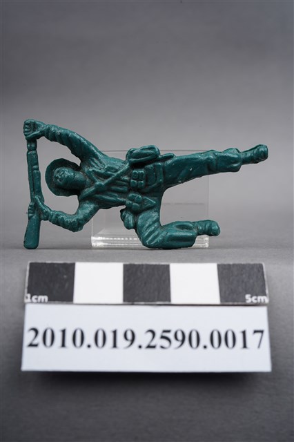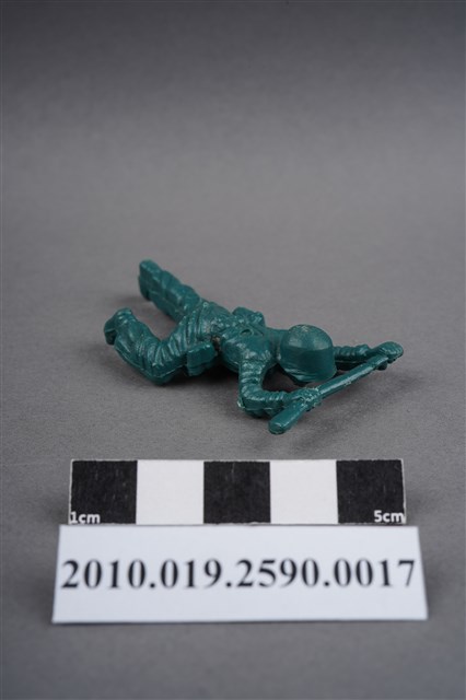 1.本物件為綠色步槍兵造型玩具士兵,寬約3公分,長約為5公分,為塑膠材質。外型為步槍兵,士兵頭戴鋼盔,身著軍服,腰帶上有彈袋與水壺,背有背包,腳著軍靴。士兵雙手持步槍,行匍匐前進姿。左大腿後側及右背部各有一圓形痕,右軍靴腳底有殘膠。物件兩側可見射出接縫線,整體有些微磨損痕跡,凹縫處有灰塵毛屑。本系列玩具士兵多為相同塑膠模版,僅有顏色不同,或是同色同塑膠模版等形式。