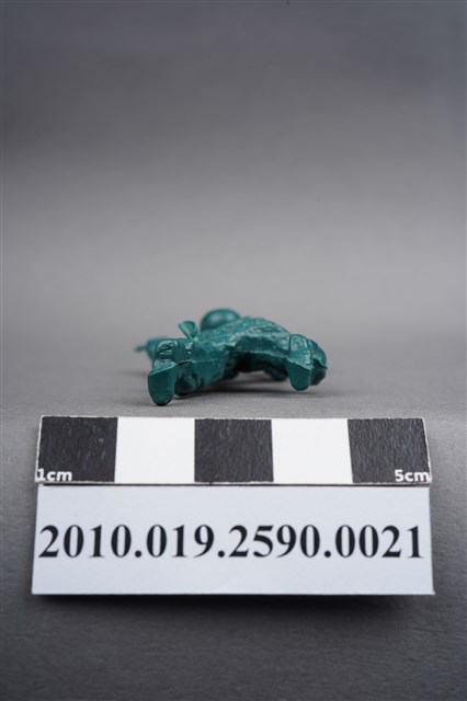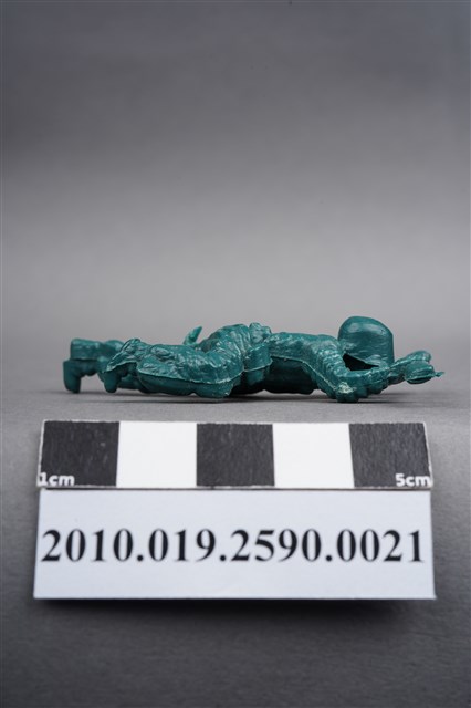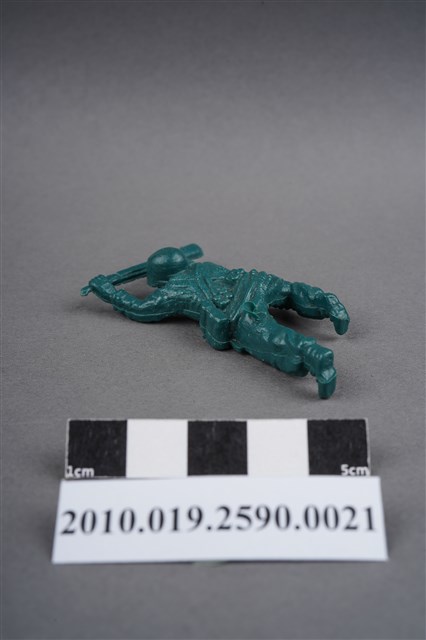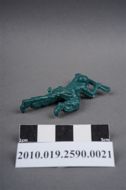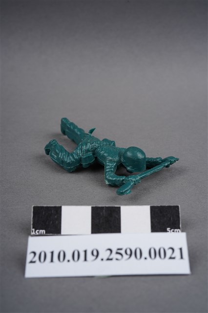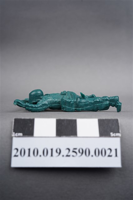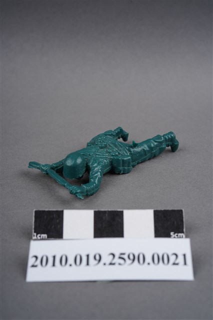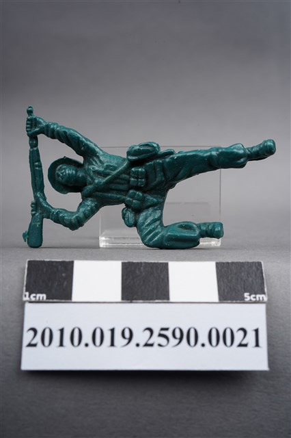 1.本物件為綠色步槍兵造型玩具士兵,寬約3公分,長約為5公分,為塑膠材質。外型為步槍兵,士兵頭戴鋼盔,身著軍服,腰帶上有彈袋與水壺,背有背包,腳著軍靴。士兵雙手持步槍,行匍匐前進姿。左大腿後側及右背部各有一圓形痕,左大腿後側的圓形痕附有殘膠。物件兩側可見射出接縫線,整體有些微磨損痕跡。本系列玩具士兵多為相同塑膠模版,僅有顏色不同,或是同色同塑膠模版等形式。