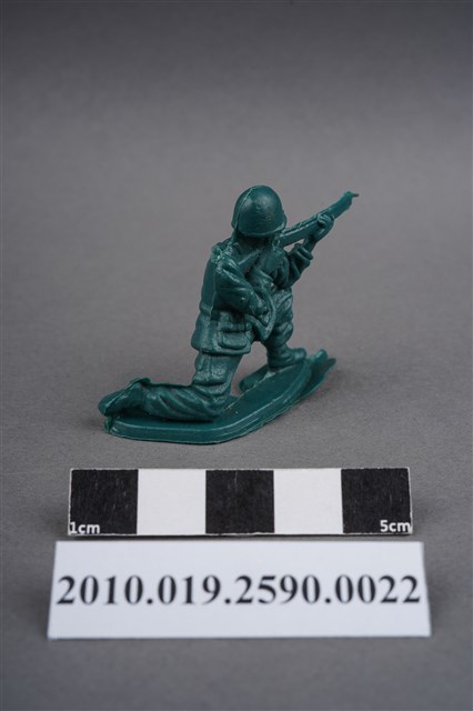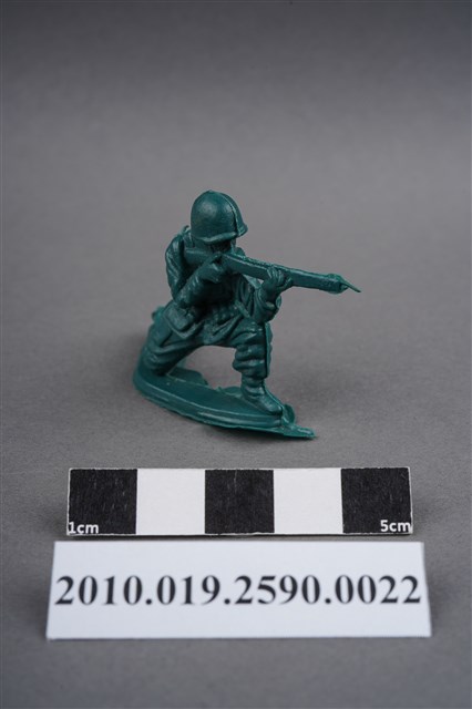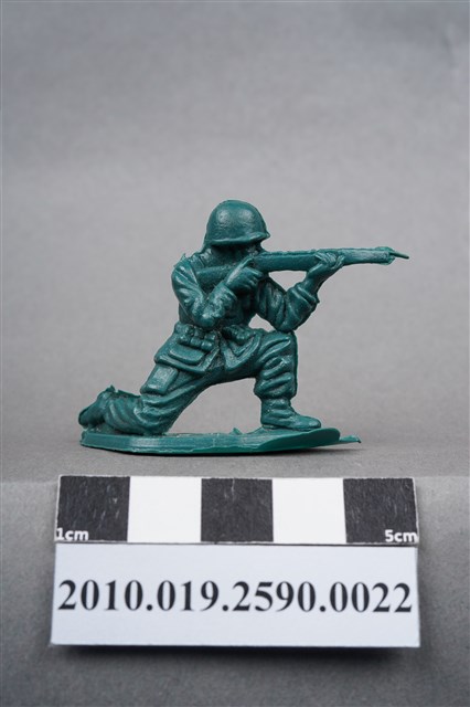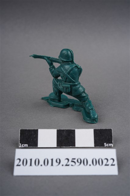 1.本物件為綠色步槍兵造型玩具士兵,高約4公分,長約為5.5公分,為塑膠材質。外型為步槍兵,士兵頭戴鋼盔,身著軍服,腰帶上有彈袋與水壺,腳著軍靴。單膝跪地,雙手持步槍瞄準前方。右肩有一射出痕及殘膠,右大腿內側及左背部各有一圓形痕,圓形痕邊緣有殘膠。物件整體底部連接著稱為「pod feet」的底板,底板邊緣有殘膠,底部有一圓洞。物件兩側可見射出接縫線。物件整體有些微磨損痕跡及灰塵。本系列玩具士兵多為相同塑膠模版,僅有顏色不同,或是同色同塑膠模版等形式。
