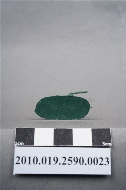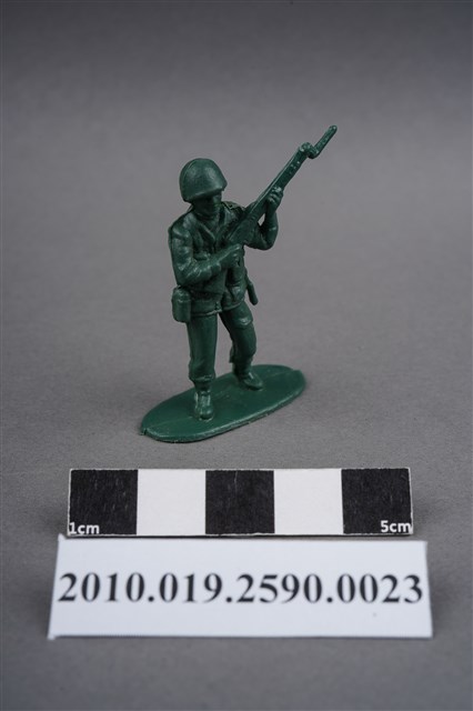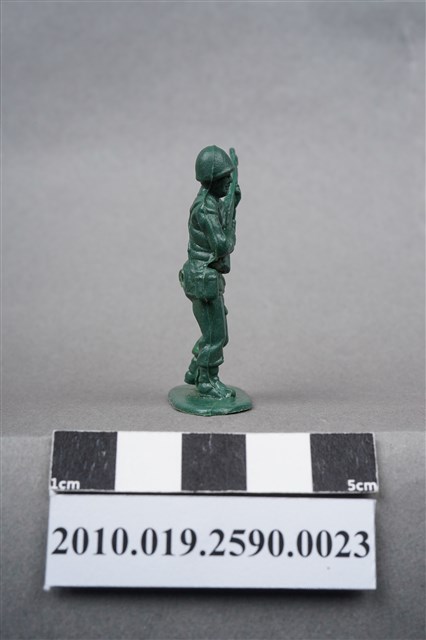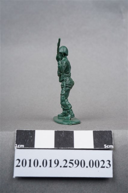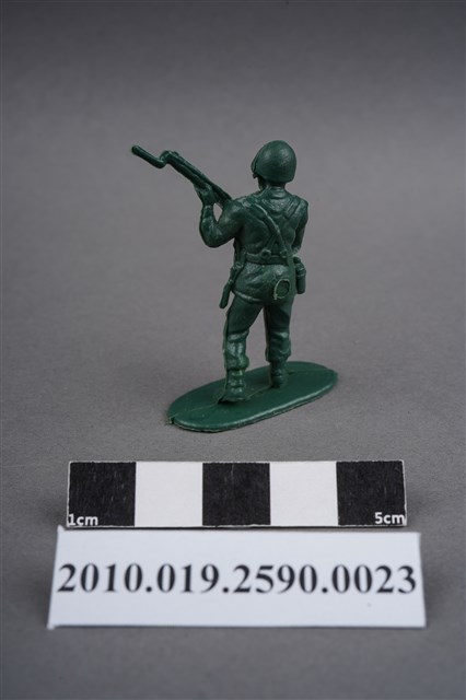 1.本物件為綠色步槍兵造型玩具士兵,高約5公分,寬約為2.5公分,為塑膠材質。外型為步槍兵,士兵頭戴鋼盔,身著軍服,腰帶上有彈袋、水壺及刺刀刀鞘,腳著軍靴,雙手斜舉步槍,步槍頂端有刺刀。臀部有一圓形痕,並有殘膠。物件整體底部連接著稱為「pod feet」的底板,底板底部平整有些許刮痕。物件兩側可見射出接縫線。本系列玩具士兵多為相同塑膠模版,僅有顏色不同,或是同色同塑膠模版等形式。