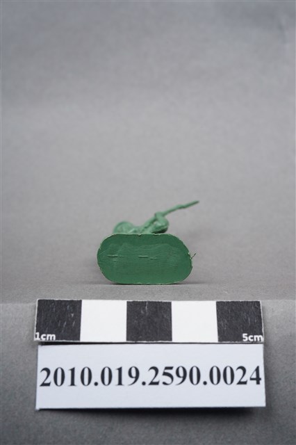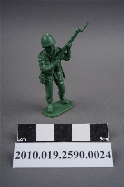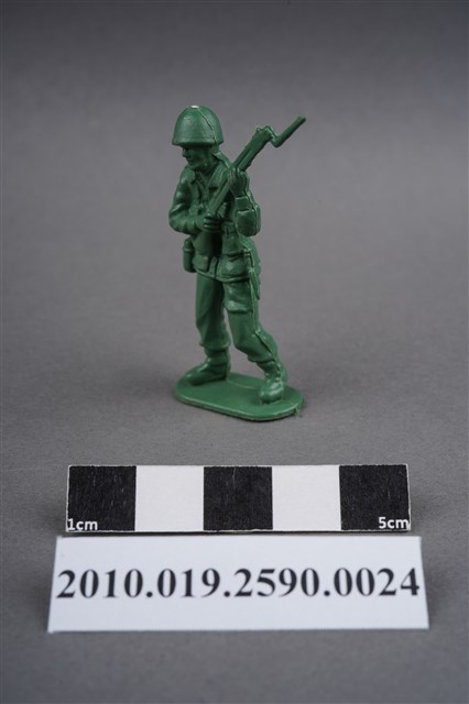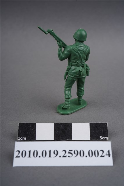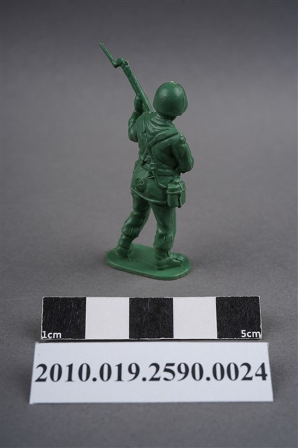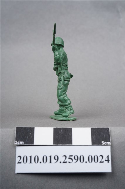 1.本物件為綠色步槍兵造型玩具士兵,高約5公分,寬約為2.5公分,為塑膠材質。外型為步槍兵,士兵頭戴鋼盔,身著軍服,腰帶上有彈袋、水壺及刺刀刀鞘,腳著軍靴,雙手斜舉步槍,步槍頂端有刺刀。臀部有一圓形痕,並有殘膠,大腿後側有似出膠不足的情況。物件整體底部連接著稱為「pod feet」的底板,底板底部有三道凸起,邊緣有些微殘膠。物件兩側可見射出接縫線。本系列玩具士兵多為相同塑膠模版,僅有顏色不同,或是同色同塑膠模版等形式。