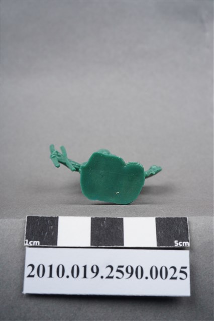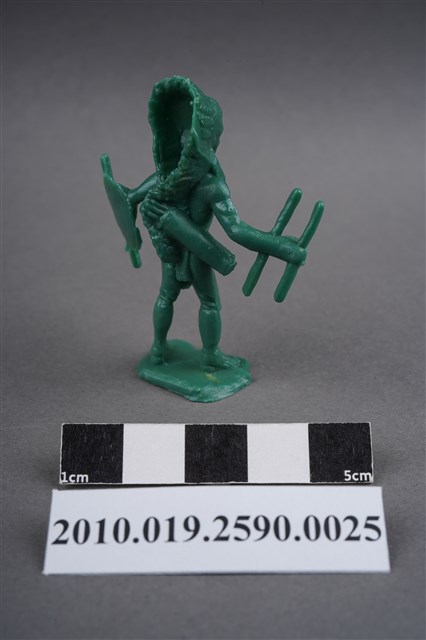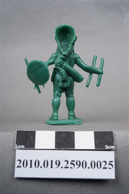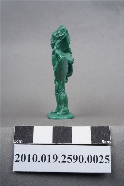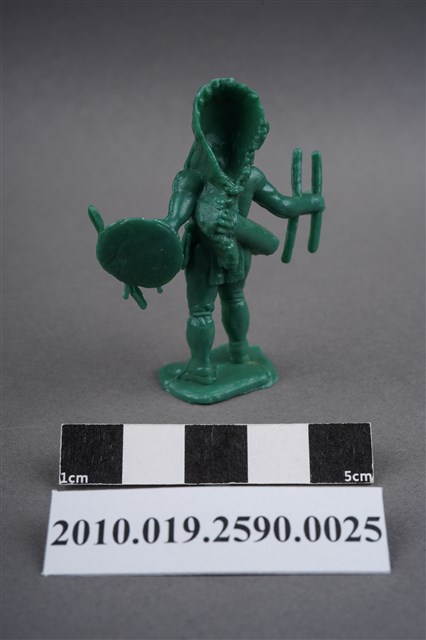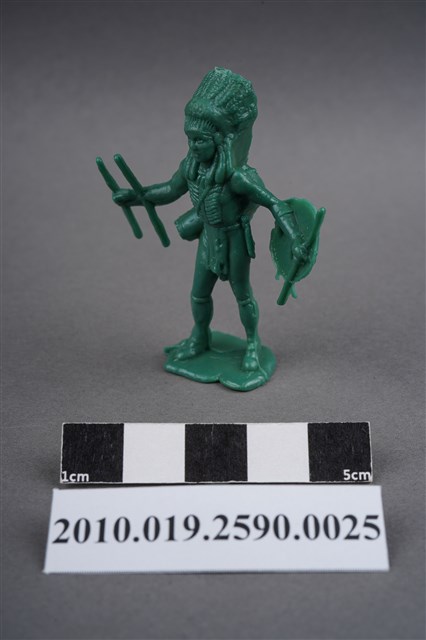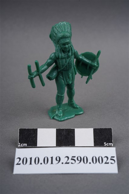1.本物件為綠色印地安人造型玩具士兵,高約5公分,寬約4公分,為塑膠材質。外型為印地安人,頭戴羽冠,胸前應為由羽冠延伸下來的飾物,著長褲,繫有腰帶,右手原為持弓,僅剩兩根短棒,左手手臂原裝備飾有羽毛的圓盾,羽毛已不存,手持一棍狀物,可能為矛。背後揹著箭筒,腳下連接著稱為「pod feet」的底板,底板平整,物件兩側可見射出接縫線。本系列玩具士兵多為相同塑膠模版,僅有顏色不同,或是同色同塑膠模版等形式。