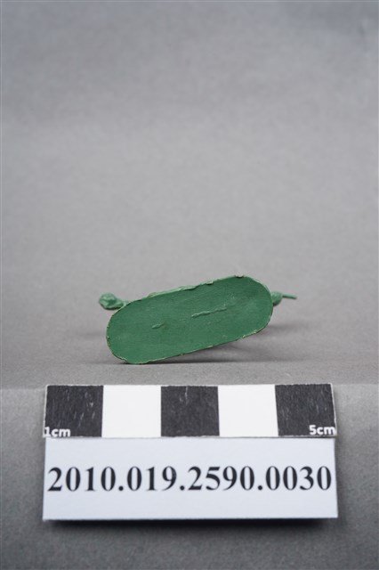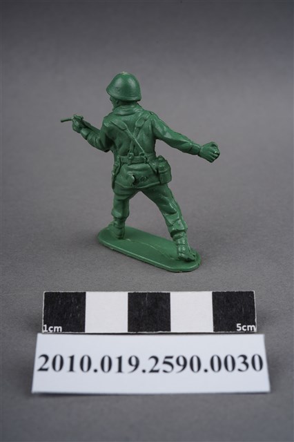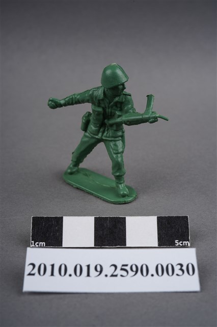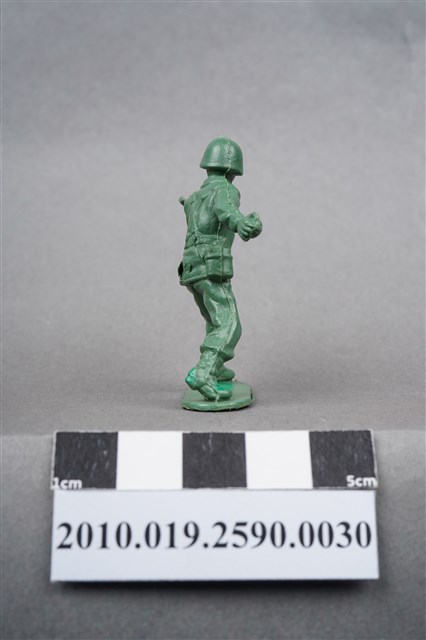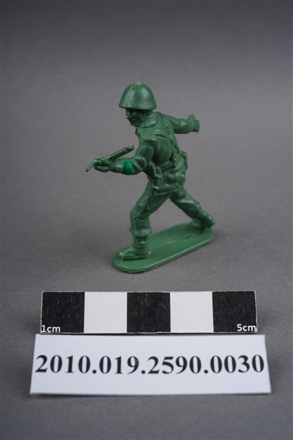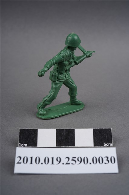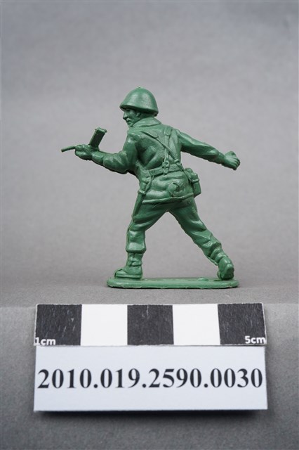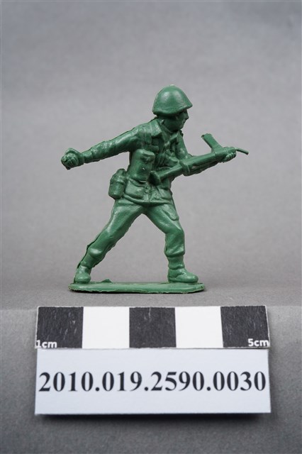 1.本物件為綠色機槍兵造型玩具士兵,高約4.5公分,寬約為5公分,為塑膠材質。外型為機槍兵,士兵頭戴鋼盔,身著軍服,腰帶上有彈袋、水壺及刺刀,腳著軍靴,左手單手持衝鋒槍,右手持手榴彈,呈正要丟擲手榴彈的姿態。臀部有一圓形痕且有殘膠。物件整體底部連接著稱為「pod feet」的底板,底板底部平整有兩道凸痕。物件兩側可見射出接縫線。本系列玩具士兵多為相同塑膠模版,僅有顏色不同,或是同色同塑膠模版等形式。