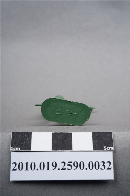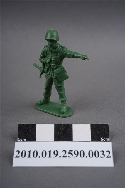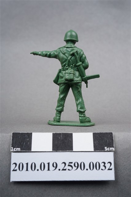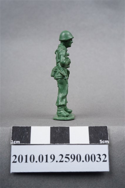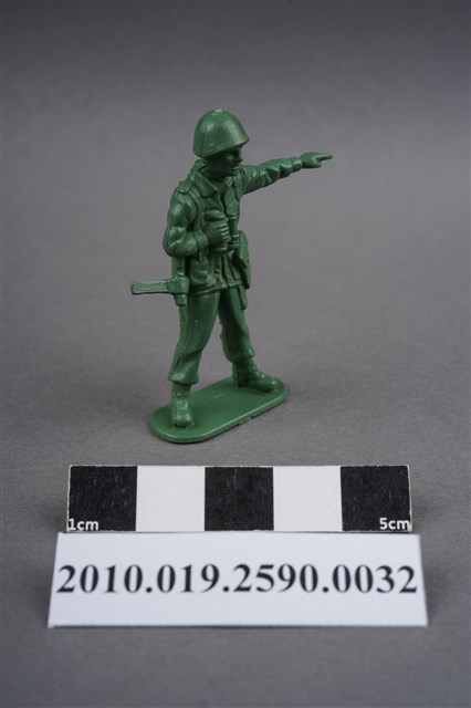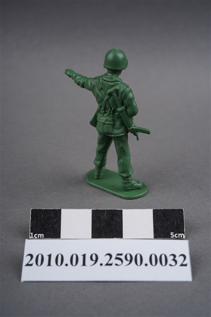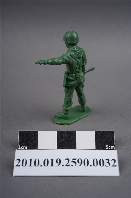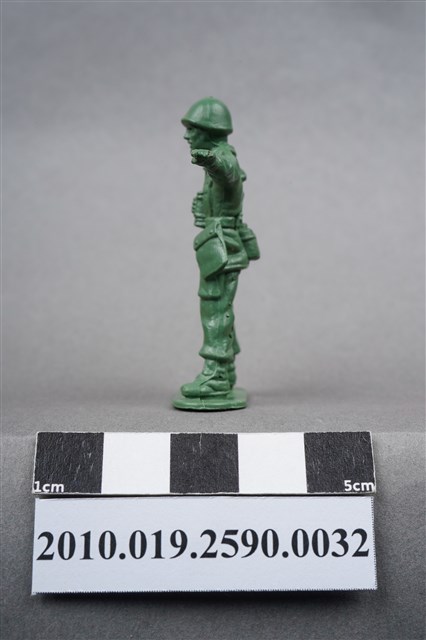 1.本物件為綠色觀測兵造型玩具士兵,高約5公分,寬約為3.5公分,為塑膠材質。外型為觀測兵,士兵頭戴鋼盔,身著軍服,腰帶上有彈袋、水壺及腰袋,腳著軍靴。衝鋒槍掛於右肩,右手持雙筒望遠鏡,左手平舉指向左方。右大腿後側有一圓形痕,褲管後方有多道凹凸痕。物件整體底部連接著稱為「pod feet」的底板,底板底部平整,有五道凸痕。物件兩側可見射出接縫線。物件整體有些微磨損痕跡。本系列玩具士兵多為相同塑膠模版,僅有顏色不同,或是同色同塑膠模版等形式。