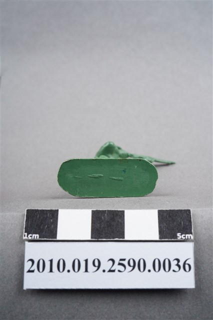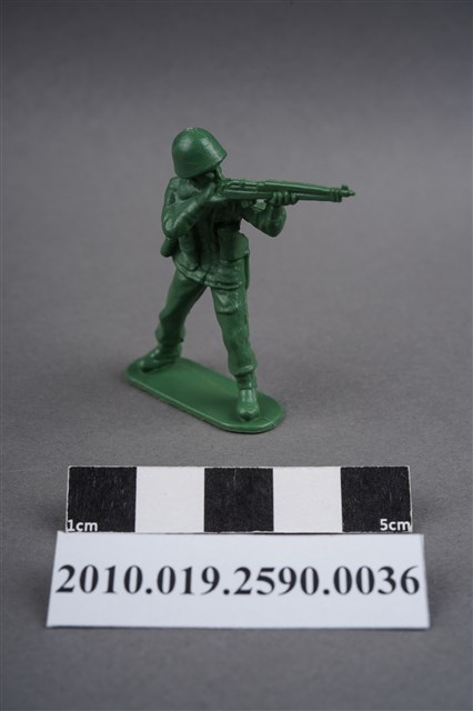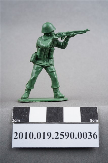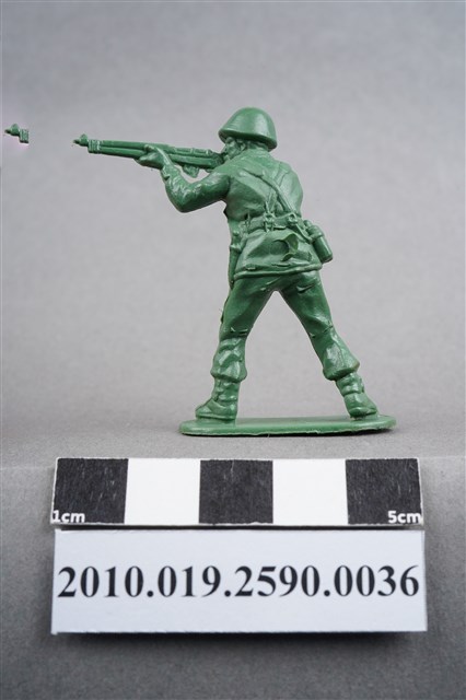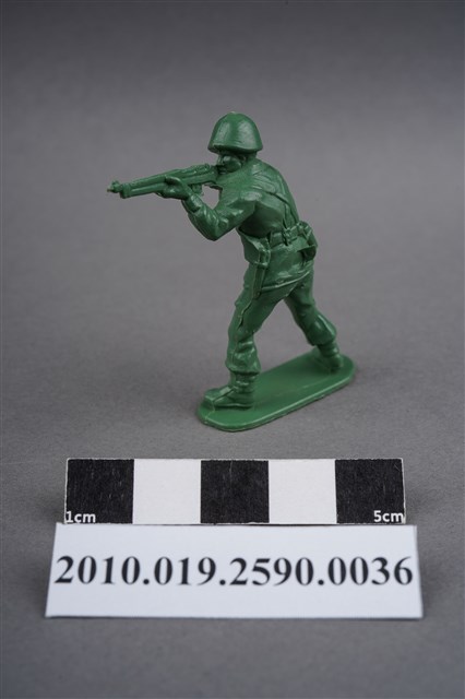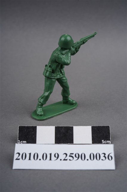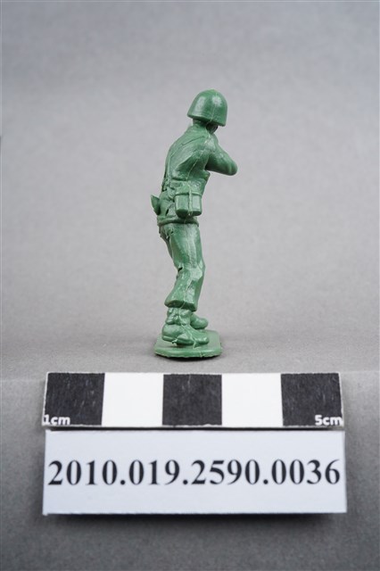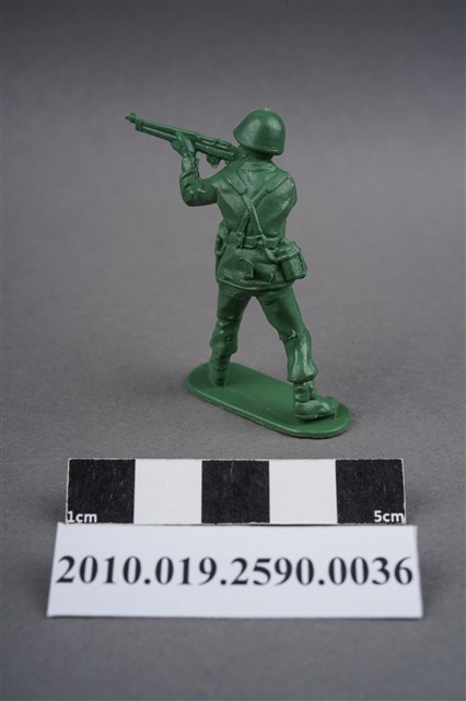 1.本物件為綠色步槍兵造型玩具士兵,高約5公分,寬約為3.5公分,為塑膠材質。外型為步槍兵,士兵頭戴鋼盔,身著軍服,腰帶上有彈袋、水壺、腰袋及刺刀,腳著軍靴,雙手高舉步槍瞄準前方。臀部有一圓形痕並有殘膠,臀部及褲管後側有數道掀起凹陷處。物件整體底部連接著稱為「pod feet」的底板,底板底部平整有三道凸痕。物件兩側可見射出接縫線。本系列玩具士兵多為相同塑膠模版,僅有顏色不同,或是同色同塑膠模版等形式。