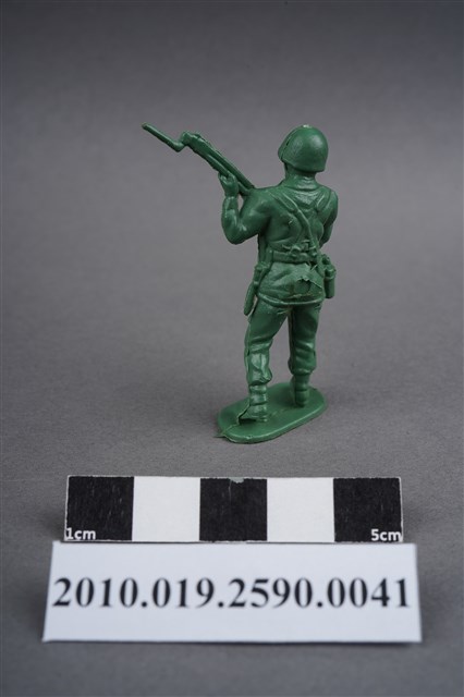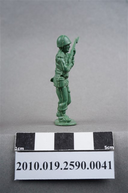 1.本物件為綠色步槍兵造型玩具士兵,高約5公分,寬約為2.5公分,為塑膠材質。外型為步槍兵,士兵頭戴鋼盔,身著軍服,腰帶上有彈袋、水壺及刺刀刀鞘,腳著軍靴,雙手斜舉步槍,步槍頂端有刺刀。臀部有一圓形痕,並有殘膠,大腿後側有掀起凹陷情況。物件整體底部連接著稱為「pod feet」的底板,底板底部有三道凸起及污損情況,邊緣有些殘膠。物件兩側可見射出接縫線。本系列玩具士兵多為相同塑膠模版,僅有顏色不同,或是同色同塑膠模版等形式。