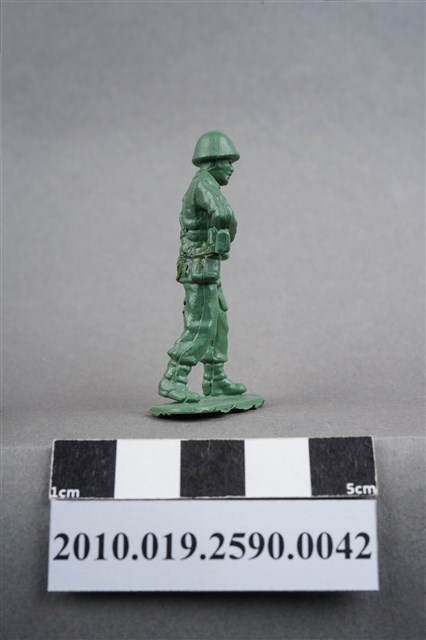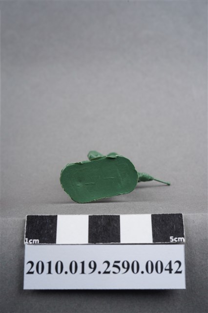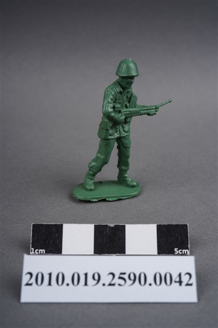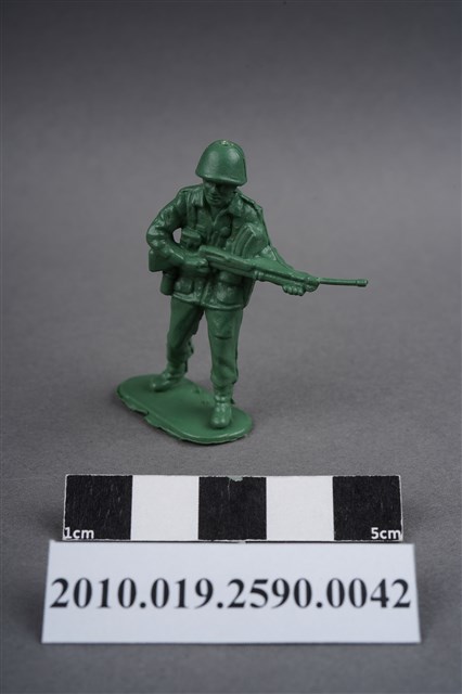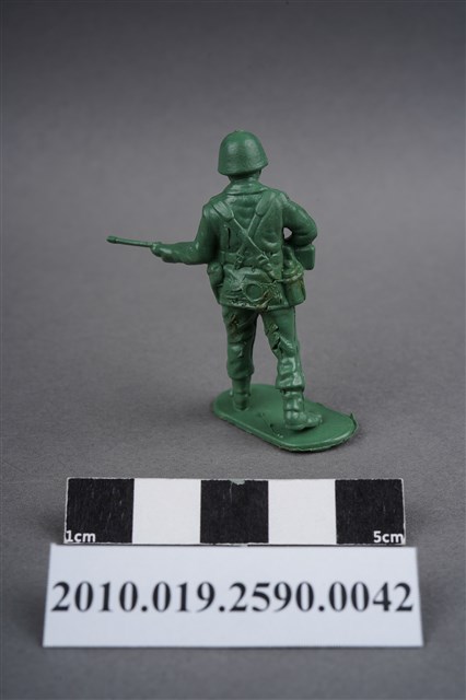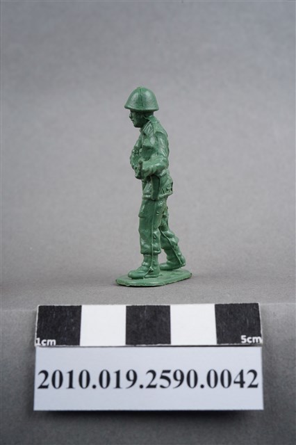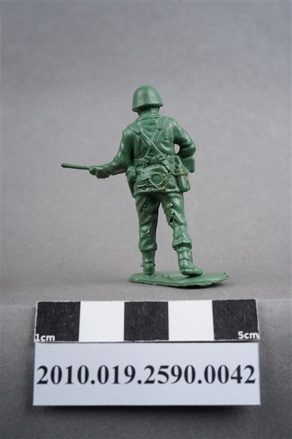 1.本物件為綠色步槍兵造型玩具士兵,高約5公分,寬約為4.5公分,為塑膠材質。外型為步槍兵,士兵頭戴鋼盔,身著軍服,腰帶上有彈袋、水壺,腳著軍靴,雙手平持步槍,步槍槍管較長,疑為狙擊步槍,左腳略向前跨一步。臀部有一圓形痕,圓形痕周圍、背部及大腿後側有數道膠痕,並有污物毛屑。物件整體底部連接著稱為「pod feet」的底板,底板邊緣及上方有殘膠,底部平整有三道凸痕。物件兩側可見射出接縫線。本系列玩具士兵多為相同塑膠模版,僅有顏色不同,或是同色同塑膠模版等形式。