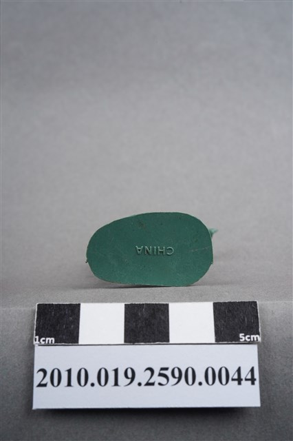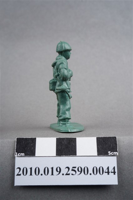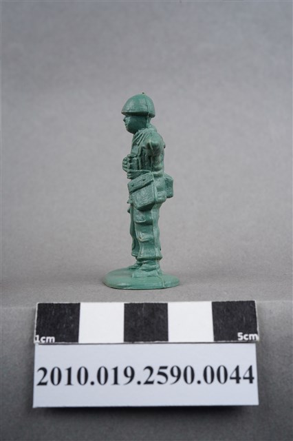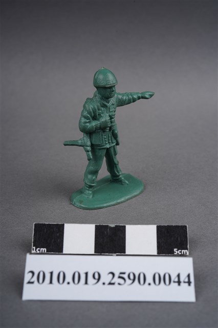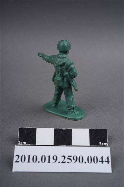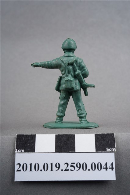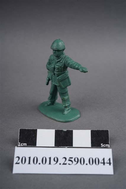 1.本物件為綠色觀測兵造型玩具士兵,高約5公分,寬約為3.5公分,為塑膠材質。外型為觀測兵,士兵頭戴鋼盔,身著軍服,腰帶上有彈袋、水壺及腰袋,腳著軍靴。衝鋒槍掛於右肩,右手持一似雙筒望遠鏡物,左手平舉指向左方,背部及小腿後側各有一圓形痕。物件整體底部連接著稱為「pod feet」的底板,底板底部有「CHINA」字樣。物件兩側可見射出接縫線。物件整體感覺粗糙。本系列玩具士兵多為相同塑膠模版,僅有顏色不同,或是同色同塑膠模版等形式。2.1938年美國玩具公司Bergen Toy and Novelty Co.開始銷售廉價的塑膠微型單色士兵系列,高約2英寸,各有不同的作戰姿勢及工具武器,美軍部分參照美軍部隊使用了軍綠色,之後推出灰色的德軍部隊及黃色的日軍部隊。1950年代因塑膠製造業的蓬勃發展,以及鉛中毒的恐慌,使得塑膠製且價格低廉的玩具士兵取代昂貴的彩繪金屬士兵,並定型為目前廣為人知的二戰系列。除了士兵系列外,市面上亦能見到牛仔與印地安人、太空人、騎士、恐龍、消防員、警察等各種角色。