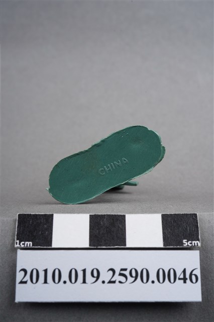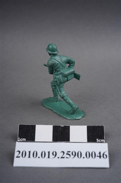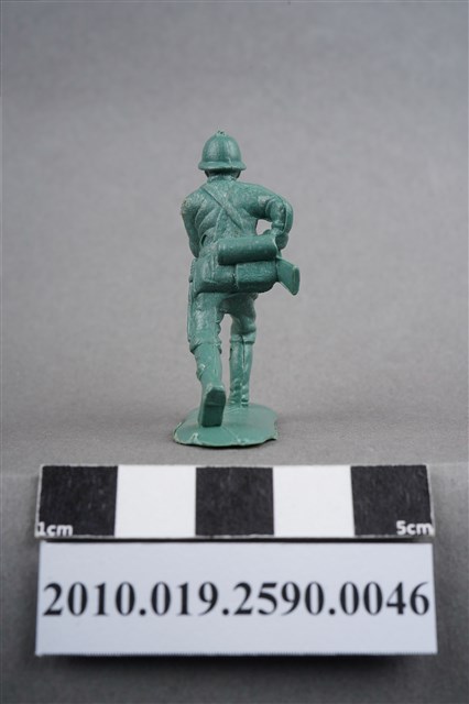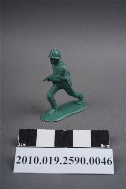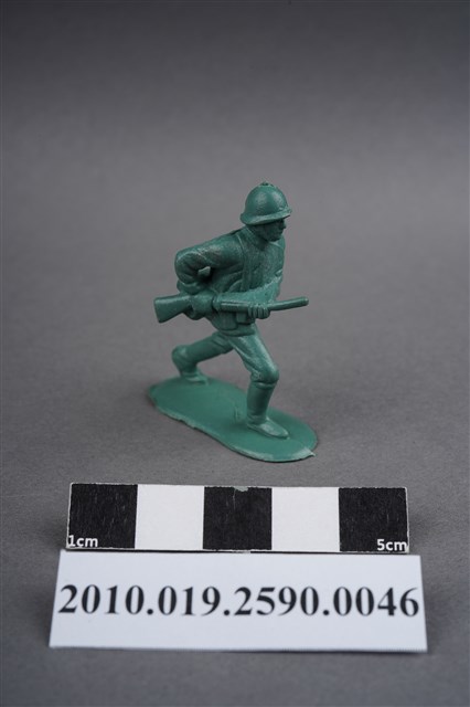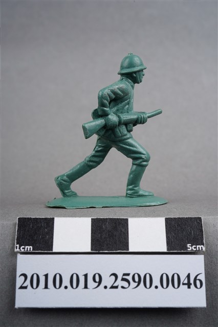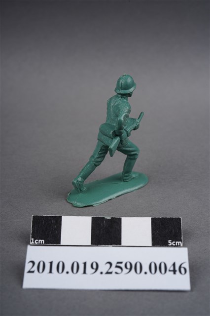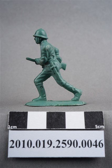 1.本物件為綠色步槍兵造型玩具士兵,高約5公分,寬約為3.5公分,為塑膠材質。外型為步槍兵,士兵頭戴鋼盔,身著軍服,腰帶上有彈袋、水壺、腰袋及軍刀,腳著軍靴,雙手持步槍置於身體右側,呈行走姿。左腰、右小腿內側及左小腿外側各有一圓形痕。物件整體底部連接著稱為「pod feet」的底板,底板邊緣有些微殘膠,底部有「CHINA」字樣,物件整體感覺粗糙。物件兩側可見射出接縫線,多處有污損痕跡。本系列玩具士兵多為相同塑膠模版,僅有顏色不同,或是同色同塑膠模版等形式。