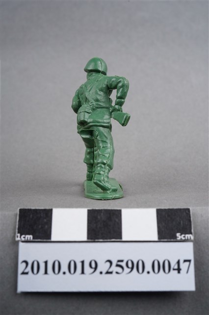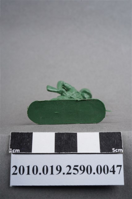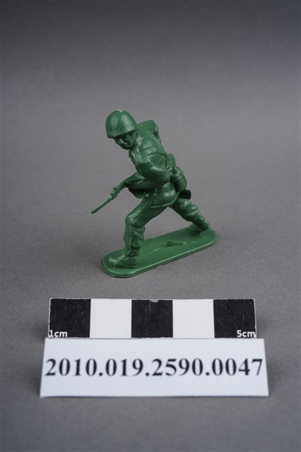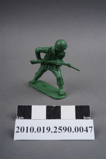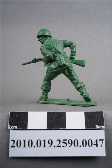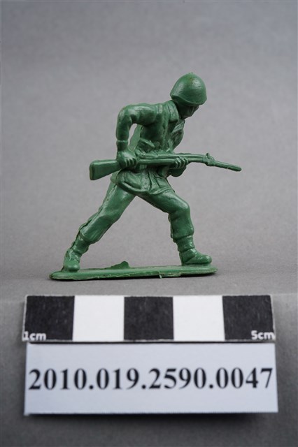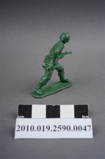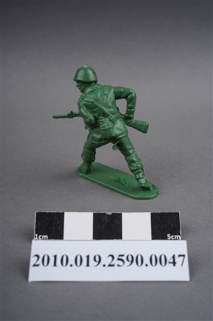 1.本物件為綠色步槍兵造型玩具士兵,高約5公分,寬約為4.5公分,為塑膠材質。外型為步槍兵,士兵頭戴鋼盔,身著軍服,腰帶上有彈袋、水壺及刺刀刀鞘,腳著軍靴,雙手持步槍於身前,步槍前端有刺刀,左腳向前呈大跨步行走狀。右大腿後側有一圓形痕,並有殘膠。物件整體底部連接著稱為「pod feet」的底板,底板上及邊緣有些微殘膠,底部平整有一凸痕。物件兩側可見射出接縫線。本系列玩具士兵多為相同塑膠模版,僅有顏色不同,或是同色同塑膠模版等形式。