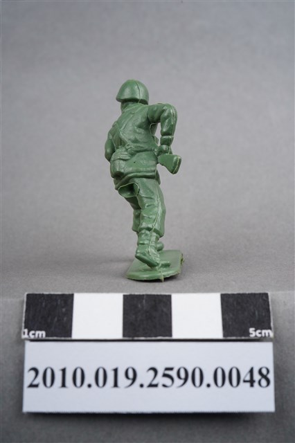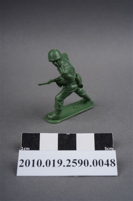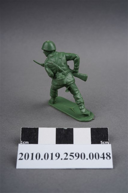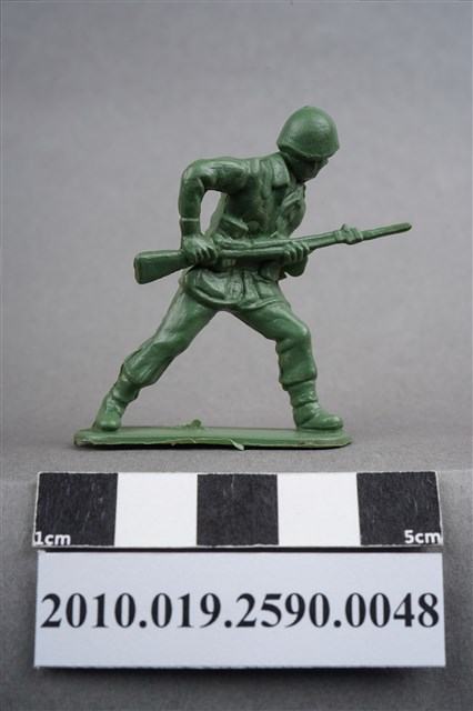 1.本物件為綠色步槍兵造型玩具士兵,高約5公分,寬約為4.5公分,為塑膠材質。外型為步槍兵,士兵頭戴鋼盔,身著軍服,腰帶上有彈袋、水壺及刺刀刀鞘,腳著軍靴,雙手持步槍於身前,步槍前端有刺刀,左腳向前呈大跨步行走狀。右大腿後側有一圓形痕,圓形痕邊緣有殘膠。物件整體底部連接著稱為「pod feet」的底板,底板上及邊緣有殘膠及污痕,底部平整有一凸痕。物件兩側可見射出接縫線。本系列玩具士兵多為相同塑膠模版,僅有顏色不同,或是同色同塑膠模版等形式。
