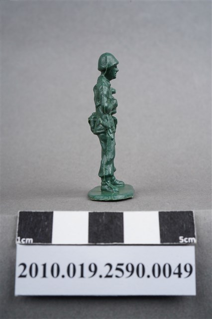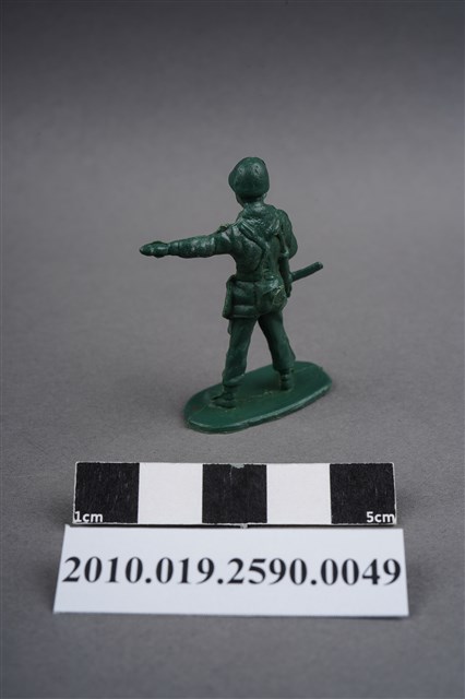 1.本物件為綠色觀測兵造型玩具士兵,高約5公分,寬約為3.5公分,為塑膠材質。外型為觀測兵,士兵頭戴鋼盔,身著軍服,腰帶上有彈袋、水壺及腰袋,腳著軍靴。衝鋒槍掛於右肩,右手持雙筒望遠鏡,左手平舉指向左方。左肩有射出痕,腰後的水壺上有圓形痕,邊緣有些殘膠。物件整體底部連接著稱為「pod feet」的底板,底部平整有刮痕。物件兩側可見射出接縫線。物件整體有些微磨損痕跡。本系列玩具士兵多為相同塑膠模版,僅有顏色不同,或是同色同塑膠模版等形式。2.1938年美國玩具公司Bergen Toy and Novelty Co.開始銷售廉價的塑膠微型單色士兵系列,高約2英寸,各有不同的作戰姿勢及工具武器,美軍部分參照美軍部隊使用了軍綠色,之後推出灰色的德軍部隊及黃色的日軍部隊。1950年代因塑膠製造業的蓬勃發展,以及鉛中毒的恐慌,使得塑膠製且價格低廉的玩具士兵取代昂貴的彩繪金屬士兵,並定型為目前廣為人知的二戰系列。除了士兵系列外,市面上亦能見到牛仔與印地安人、太空人、騎士、恐龍、消防員、警察等各種角色。