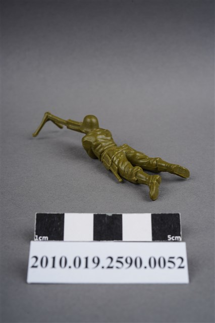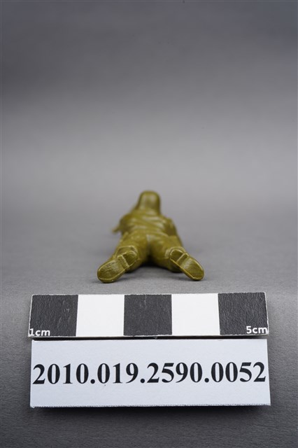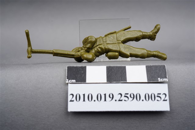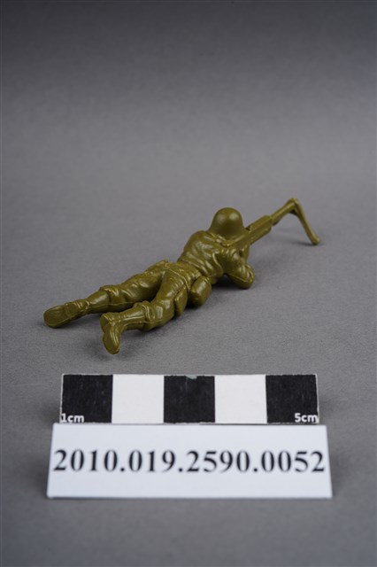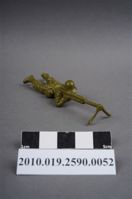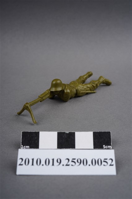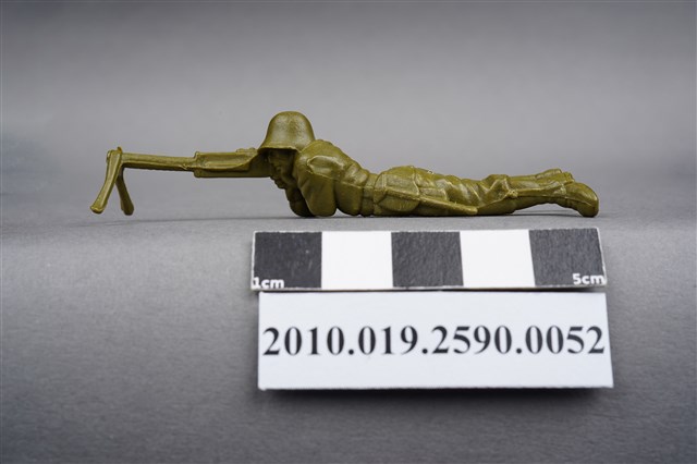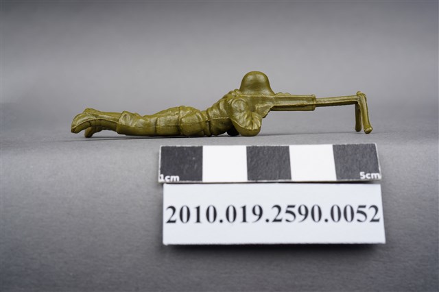 1.本物件為綠色狙擊兵造型玩具士兵,高約1.5公分,長約為7.5公分,為塑膠材質。外型為狙擊兵,士兵頭戴鋼盔,身著軍服,腰帶上有水壺及折疊式工兵鏟,腳著軍靴,呈趴卧姿,雙手持握立於雙腳架上的狙擊槍,做瞄準貌。臀部有一圓形痕。物件兩側可見射出接縫線。本系列玩具士兵多為相同塑膠模版,僅有顏色不同,或是同色同塑膠模版等形式。