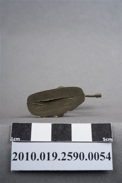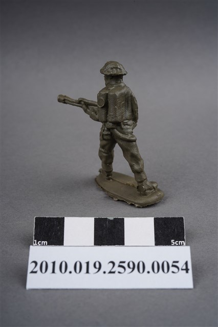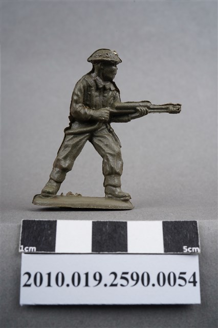 1.本物件為綠色步槍兵造型玩具士兵,高約5公分,寬約為5公分,為塑膠材質。外型為步槍兵,士兵頭戴鋼盔,身著軍服,腳著軍靴,雙手持火焰噴射器於身前,火焰噴射器尾部有軟管連接至背上的燃料罐,燃料罐下有水壺,左腳向前站立。燃料罐及雙腳腳踝各有一圓形痕,略凸出且邊緣有殘膠。物件整體底部連接著稱為「pod feet」的底板,底板上及邊緣有殘膠,底部有接縫痕及殘膠。物件兩側可見射出接縫線,物件整體略顯粗糙。本系列玩具士兵多為相同塑膠模版,僅有顏色不同,或是同色同塑膠模版等形式。2.1938年美國玩具公司Bergen Toy and Novelty Co.開始銷售廉價的塑膠微型單色士兵系列,高約2英寸,各有不同的作戰姿勢及工具武器,美軍部分參照美軍部隊使用了軍綠色,之後推出灰色的德軍部隊及黃色的日軍部隊。1950年代因塑膠製造業的蓬勃發展,以及鉛中毒的恐慌,使得塑膠製且價格低廉的玩具士兵取代昂貴的彩繪金屬士兵,並定型為目前廣為人知的二戰系列。除了士兵系列外,市面上亦能見到牛仔與印地安人、太空人、騎士、恐龍、消防員、警察等各種角色。