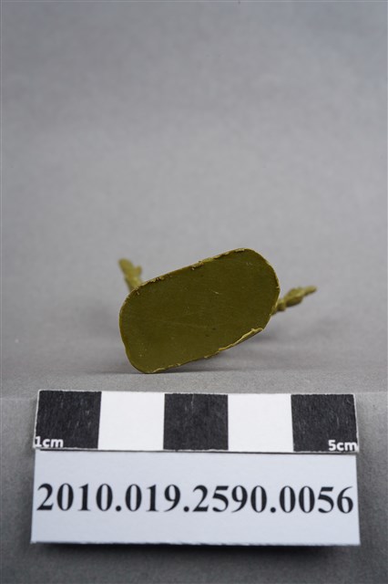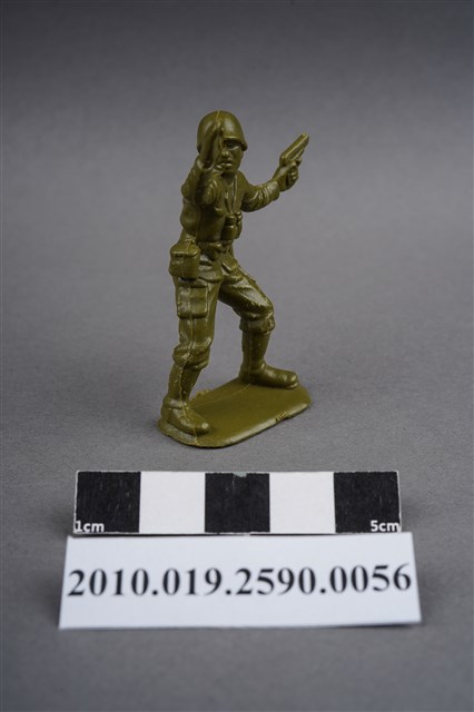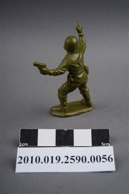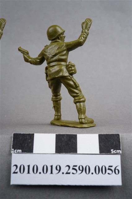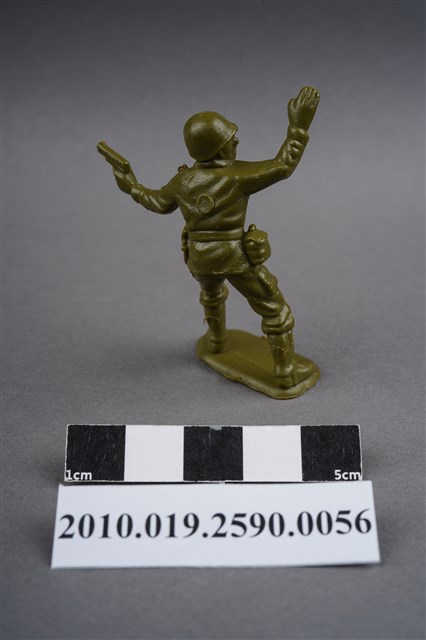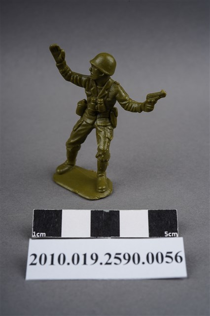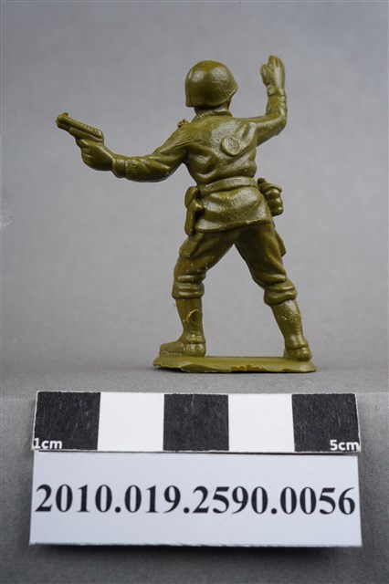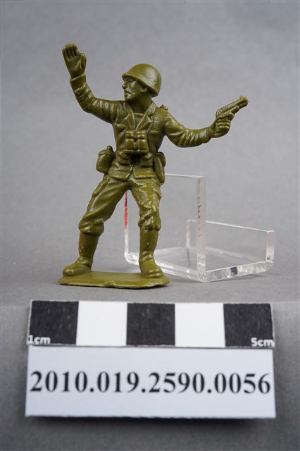 1.本物件為綠色軍官造型玩具士兵,高約5公分,寬約為3公分,為塑膠材質。外型為軍官,頭戴鋼盔,身著軍服,胸前掛有雙筒望遠鏡,腰帶上有彈袋、水壺及手槍袋,腳著軍靴,左手持手槍,右手高舉,臉朝向右方,似指揮後方。背部及兩小腿後方各有一圓形痕,背部圓形痕突出,左肩有殘膠,左大腿部位有許多磨損痕跡。物件整體底部連接著稱為「pod feet」的底板,底板邊緣有些微溢膠,底部平整有刮痕。物件兩側可見射出接縫線。本系列玩具士兵多為相同塑膠模版,僅有顏色不同,或是同色同塑膠模版等形式。2.1938年美國玩具公司Bergen Toy and Novelty Co.開始銷售廉價的塑膠微型單色士兵系列,高約2英寸,各有不同的作戰姿勢及工具武器,美軍部分參照美軍部隊使用了軍綠色,之後推出灰色的德軍部隊及黃色的日軍部隊。1950年代因塑膠製造業的蓬勃發展,以及鉛中毒的恐慌,使得塑膠製且價格低廉的玩具士兵取代昂貴的彩繪金屬士兵,並定型為目前廣為人知的二戰系列。除了士兵系列外,市面上亦能見到牛仔與印地安人、太空人、騎士、恐龍、消防員、警察等各種角色。