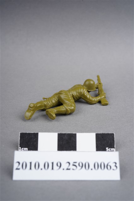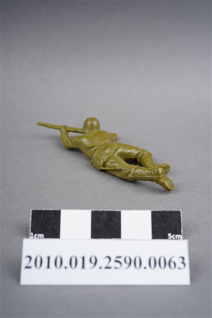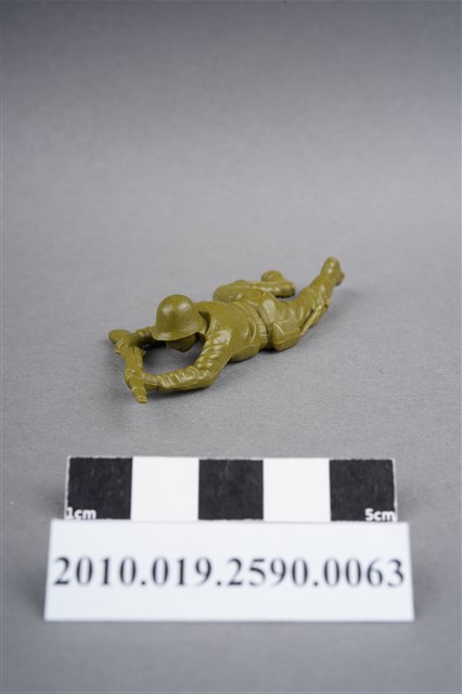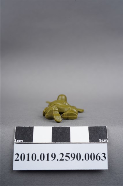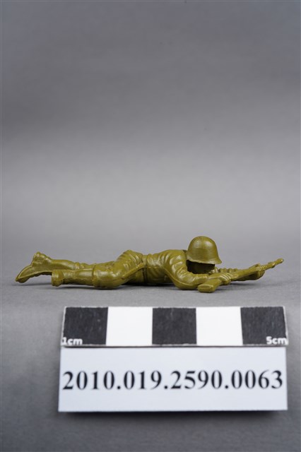1.本物件為綠色步槍兵造型玩具士兵,寬約3公分,長約為6公分,為塑膠材質。外型為步槍兵,士兵頭戴鋼盔,身著軍服,腰帶上有工兵鏟及刺刀,腳著軍靴。士兵雙手持步槍,行匍匐前進姿。右臀處有一圓形痕,左膝外側有射出痕。物件兩側可見射出接縫線。本系列玩具士兵多為相同塑膠模版,僅有顏色不同,或是同色同塑膠模版等形式。