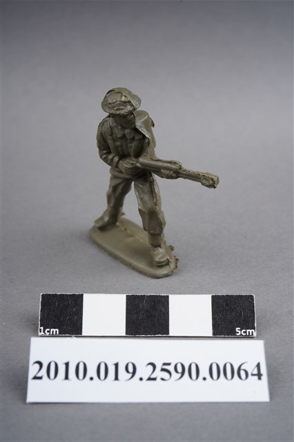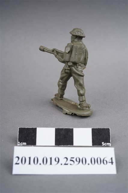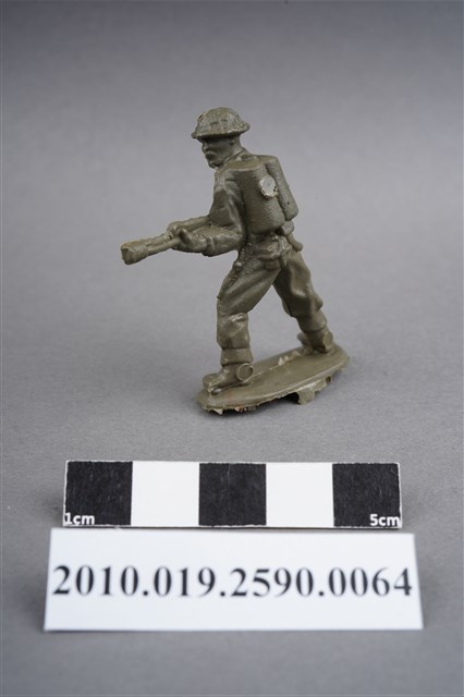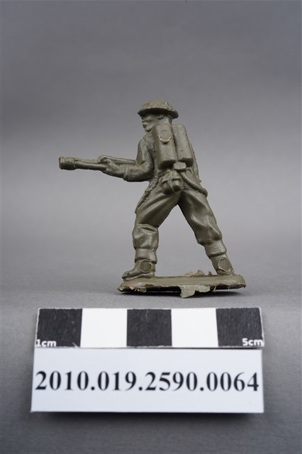 1.本物件為綠色步兵造型玩具士兵,高約5公分,寬約為5公分,為塑膠材質。外型為步槍兵,士兵頭戴鋼盔,身著軍服,腳著軍靴,雙手持火焰噴射器於身前,火焰噴射器尾部有軟管連接至背上的燃料罐,燃料罐下有水壺,左腳向前站立。燃料罐及雙腳腳踝各有一圓形痕,略凸出且邊緣有殘膠。物件整體底部連接著稱為「pod feet」的底板,底板及邊緣有殘膠,底部有接縫痕及殘膠。物件兩側可見射出接縫線,物件整體造型粗糙。本系列玩具士兵多為相同塑膠模版,僅有顏色不同,或是同色同塑膠模版等形式。2.1938年美國玩具公司Bergen Toy and Novelty Co.開始銷售廉價的塑膠微型單色士兵系列,高約2英寸,各有不同的作戰姿勢及工具武器,美軍部分參照美軍部隊使用了軍綠色,之後推出灰色的德軍部隊及黃色的日軍部隊。1950年代因塑膠製造業的蓬勃發展,以及鉛中毒的恐慌,使得塑膠製且價格低廉的玩具士兵取代昂貴的彩繪金屬士兵,並定型為目前廣為人知的二戰系列。除了士兵系列外,市面上亦能見到牛仔與印地安人、太空人、騎士、恐龍、消防員、警察等各種角色。